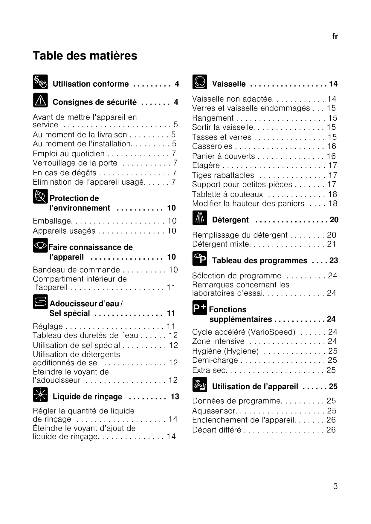 2 Nettoyage et maintenance Nettoyage et maintenance Pour éviter tout problème, il est recommandé de contrôler et d’entretenir régulièrement votre appareil. Vous gagnerez ainsi du temps et éviterez les ennuis. Etat général de la machine ヽ Vérifiez l’absence de dépôts de graisse et de calcaire dans l’enceinte de lavage. Si de tels dépôts existent : ヽ Emplissez le compartiment à détergent de détergent. Faites fonctionner l’appareil à vide réglé sur le programme présentant la température de rinçage maximale. Pour nettoyer l’appareil, n’utilisez que des produits nettoyants / détergents spécialement adaptés aux lave-vaisselle. ヽ Afin que le joint de porte reste toujours propre et hygiénique, il faut le nettoyer régulièrement avec un essuie-tout humide et un peu de produit vaisselle. ヽ Si l’appareil va rester quelques temps sans servir, laissez la porte entrebâillée afin qu’aucune mauvaise odeur ne se développe. Pour nettoyer votre lave-vaisselle, n’utilisez jamais de nettoyeur à vapeur. Le fabricant décline toute responsabilité des dommages consécutifs. Essuyez régulièrement la face frontale de l’appareil et le bandeau à l’aide d’un essuie-tout légèrement humecté ; de l’eau et un peu de produit vaisselle suffisent. Evitez les éponges munies d’un revêtement rêche, ainsi que les détergents récurants, car les deux produits pourraient rayer les surfaces. Sur les appareils en acier inox : pour écarter le risque de corrosion, évitez d’utiliser des essuie-tout en matériau- éponge ou lavez-les plusieurs fois à fond avant de vous en servir. m Mise en garde – Risque sanitaire N’utilisez jamais d’autres produits nettoyants domestiques, contenant par exemple du chlore ! Sel spécial et liquide de rinçage ヽ Contrôlez les indicateurs de manque de produit ` et X. Rajoutez le cas échéant du sel et / ou du liquide de rinçage.Nettoyage et maintenance fr
