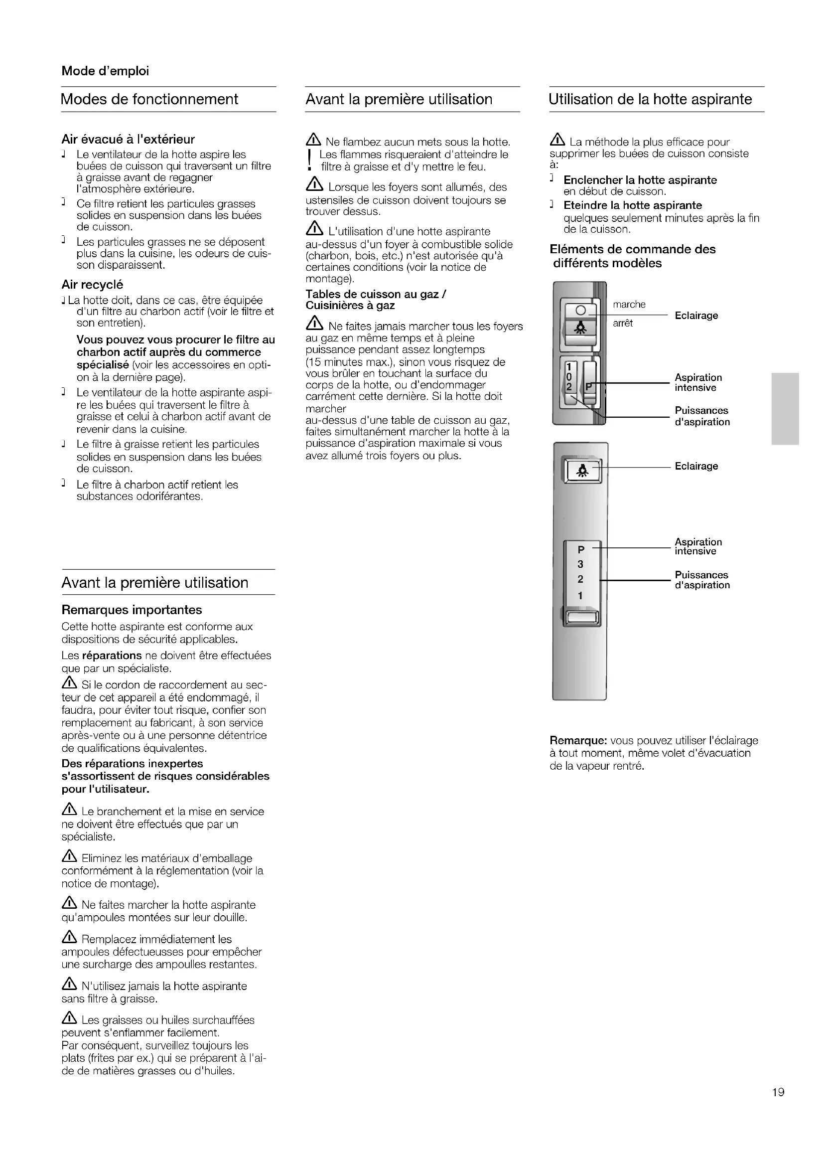 Enclencher la hotte aspirante en début de cuisson. Eteindre la hotte aspirante quelques seulement minutes après la finde la cuisson. Eléments de commande des différents modèles Remarque: vous pouvez utiliser l'éclairageà tout moment, même volet d'évacuationde la vapeur rentré.