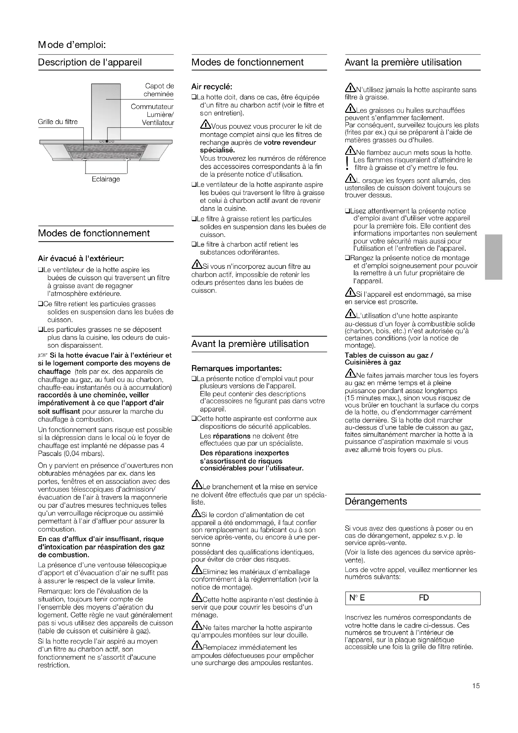 ode d’emploi: Eclairage Grille du filtreCapot decheminéeCommutateurLumière/VentilateurAir recyclé:q La hotte doit, dans ce cas, être équipéed'un filtre au charbon actif (voir le filtre et on entretien). 몇 Vous pouvez vous procurer le kit de montage complet ainsi que les filtres de rechange auprès de votre revendeur spécialisé. ous trouverez les numéros de référencedes accessoires correspondants à la fin de la présente notice d'utilisation.q Le ventilateur de la hotte aspirante aspire es buées qui traversent le filtre à graisseet celui à charbon actif avant de revenirdans la cuisine.q Le filtre à graisse retient les particulessolides en suspension dans les buées decuisson.q Le filtre à charbon actif retient les substances odoriférantes. 몇 Si vous n'incorporez aucun filtre au charbon actif, impossible de retenir lesodeurs présentes dans les buées de cuisson. Dérangements Si vous avez des questions à poser ou encas de dérangement, appelez s.v.p. le service après-vente. (Voir la liste des agences du service après-vente).Lors de votre appel, veuillez mentionner lesnuméros suivants: N° E FD Inscrivez les numéros correspondants devotre hotte dans le cadre ci-dessus. Cesnuméros se trouvent à l'intérieur de l'appareil, sur la plaque signalétique accessible une fois la grille de filtre retirée. Avant la première utilisation