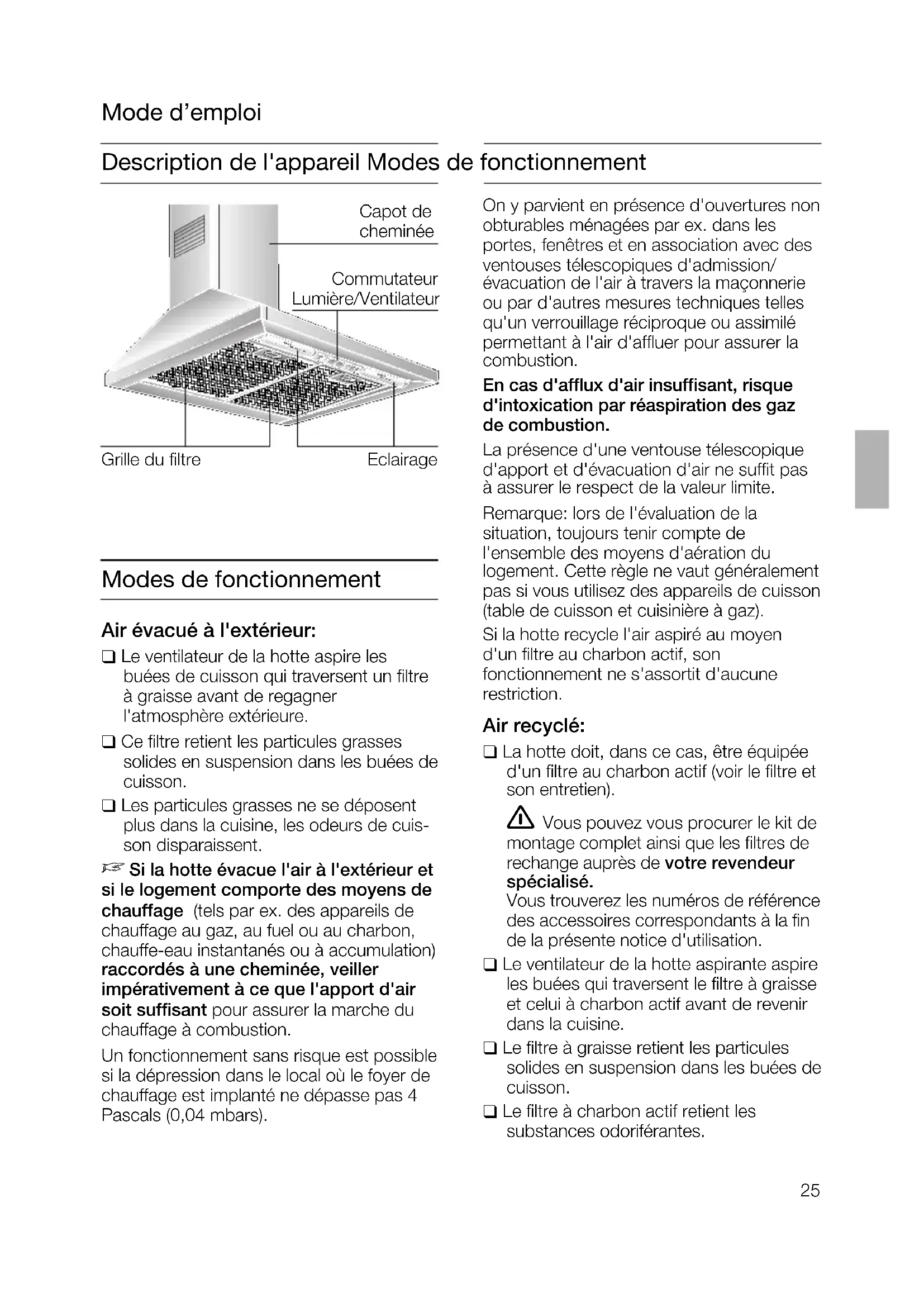 stuk met twee korte schroeven aan de zijkant vastschroeven op de bevestigingshaak.25 Description de l'appareil Modes de fonctionnement Modes de fonctionnement Air évacué à l'extérieur: ❑ Le ventilateur de la hotte aspire les buées de cuisson qui traversent un filtre à graisse avant de regagner l'atmosphère extérieure. ❑ Ce filtre retient les particules grasses solides en suspension dans les buées de cuisson. ❑ Les particules grasses ne se déposent plus dans la cuisine, les odeurs de cuis- son disparaissent.