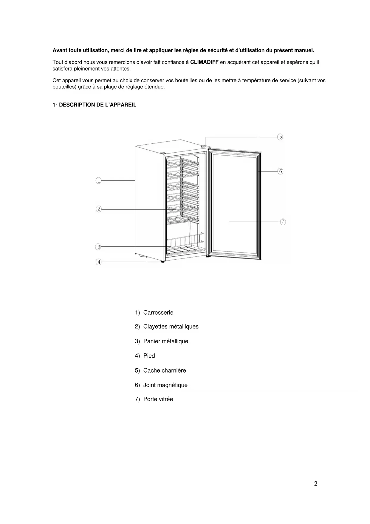 ……………………………… 39 ……………………………. 762 Avant toute utilisation, merci de lire et appliquer les règles de sécurité et d'utilisation du présent manuel. Tout d’abord nous vous remercions d’avoir fait confiance à CLIMADIFF en acquérant cet appareil et espérons qu’il satisfera pleinement vos attentes. Cet appareil vous permet au choix de conserver vos bouteilles ou de les mettre à température de service (suivant vos bouteilles) grâce à sa plage de réglage étendue.