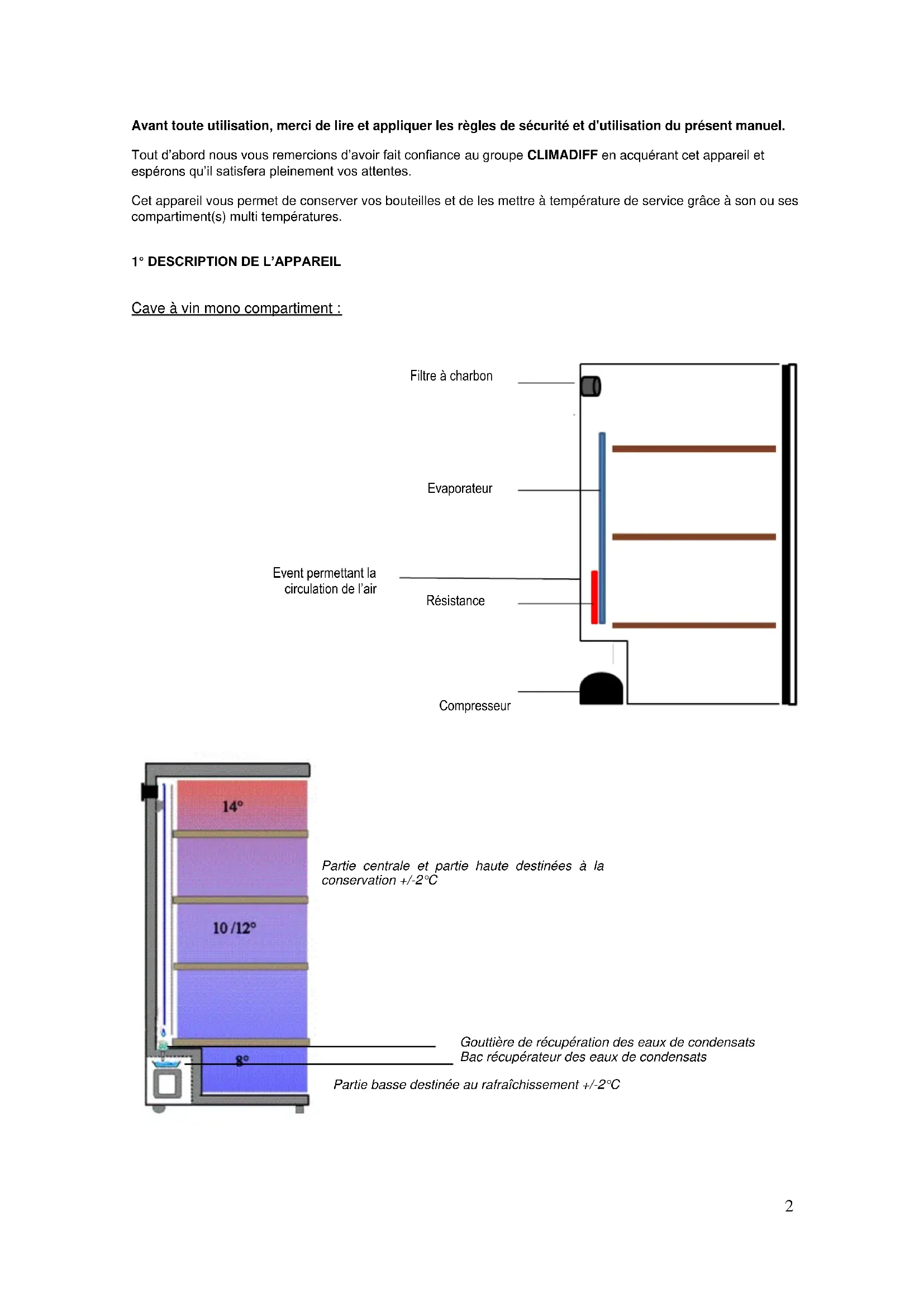 ………………………p 34 ……………………………p 66.2 Avant toute utilisation, merci de lire et appliquer les règles de sécurité et d'utilisation du présent manuel. Tout d‟abord nous vous remercions d‟avoir fait confiance au groupe CLIMADIFF en acquérant cet appareil et espérons qu‟il satisfera pleinement vos attentes. Cet appareil vous permet de conserver vos bouteilles et de les mettre à température de service grâce à son ou ses compartiment(s) multi températures.