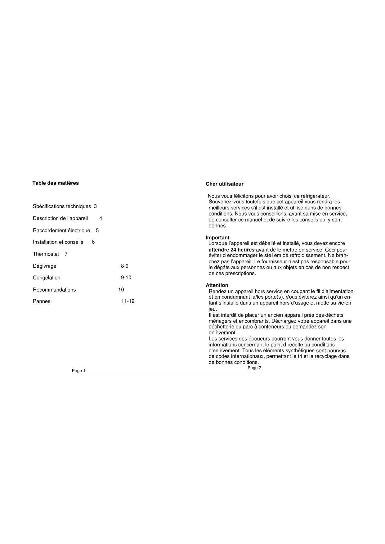Spécifications techniques 3 Description de l’appareil 4 Raccordement électrique 5 Installation et conseils 6 Thermostat 7 Dégivrage 8-9 Congélation 9-10 Recommandations 10 Pannes 11-12