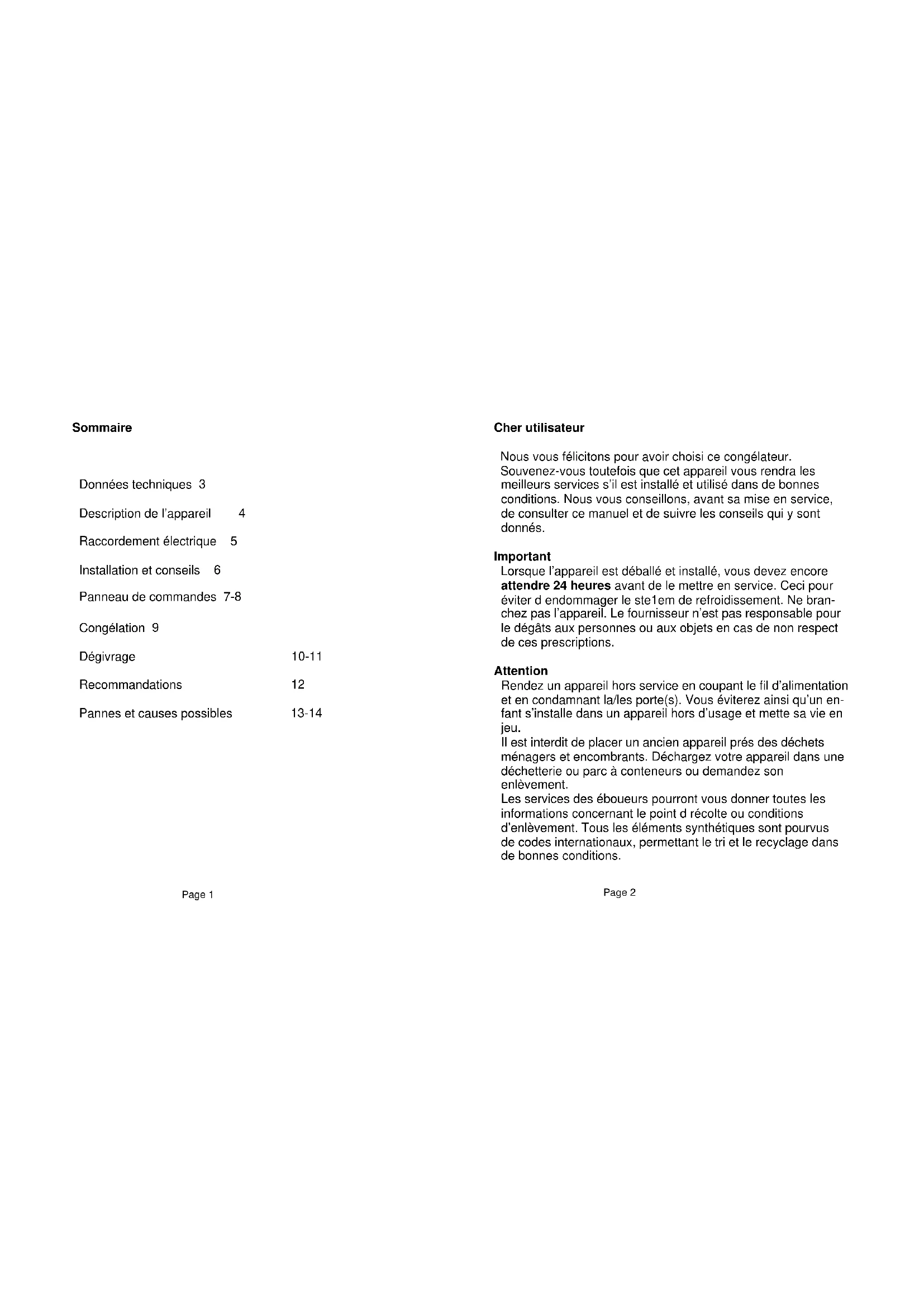 Données techniques 3 Description de l’appareil 4 Raccordement électrique 5 Installation et conseils 6 Panneau de commandes 7-8 Congélation 9 Dégivrage 10-11 Recommandations 12 Pannes et causes possibles 13-14
