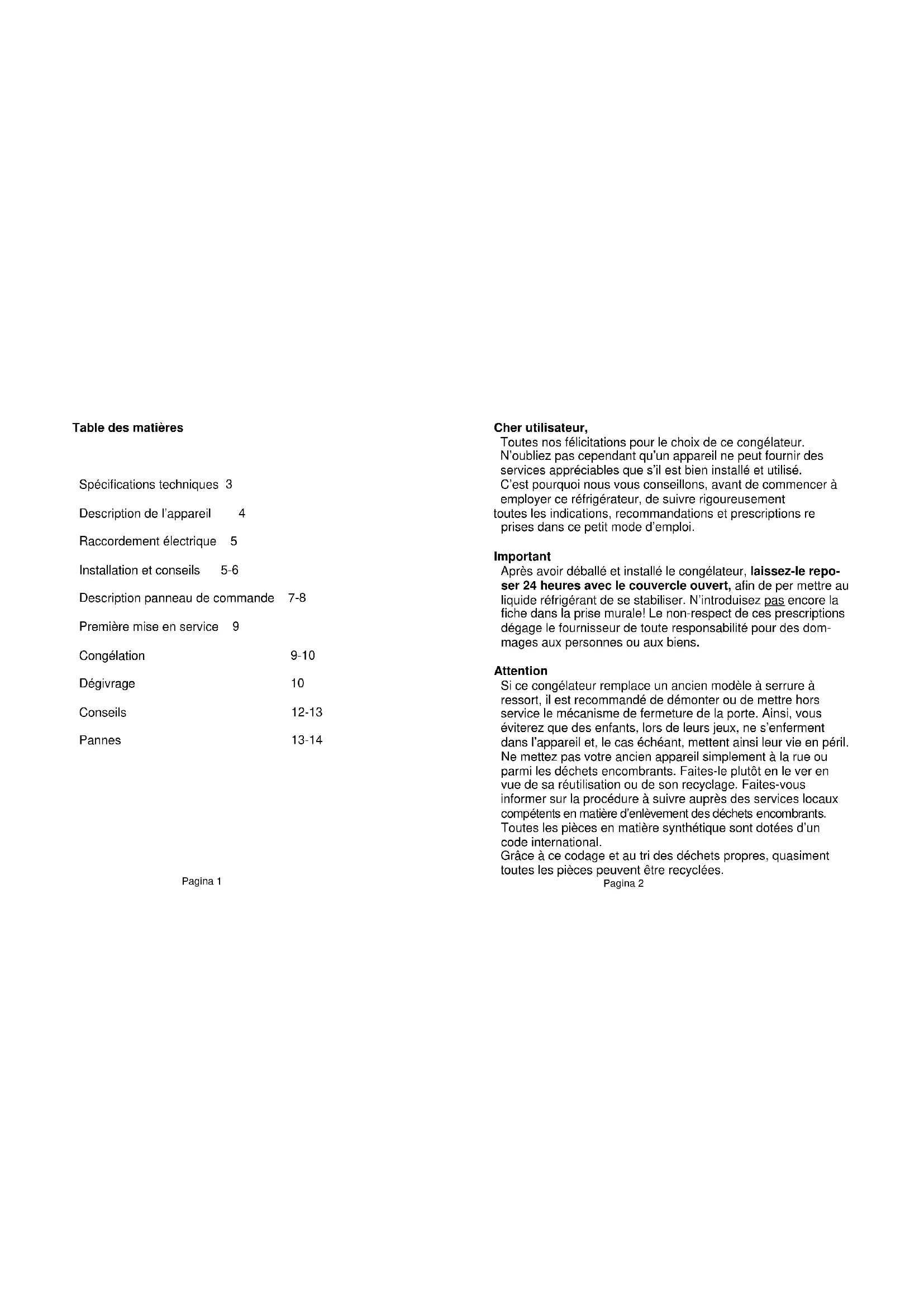 Toutes nos félicitations pour le choix de ce congélateur. N'oubliez pas cependant qu'un appareil ne peut fournir des services appréciables que s'il est bien installé et utilisé. C'est pourquoi nous vous conseillons, avant de commencer à employer ce réfrigerateur, de suivre rigoureusement toutes les indications, recommandations et prescriptions reprises dans ce petit mode d'emploi.