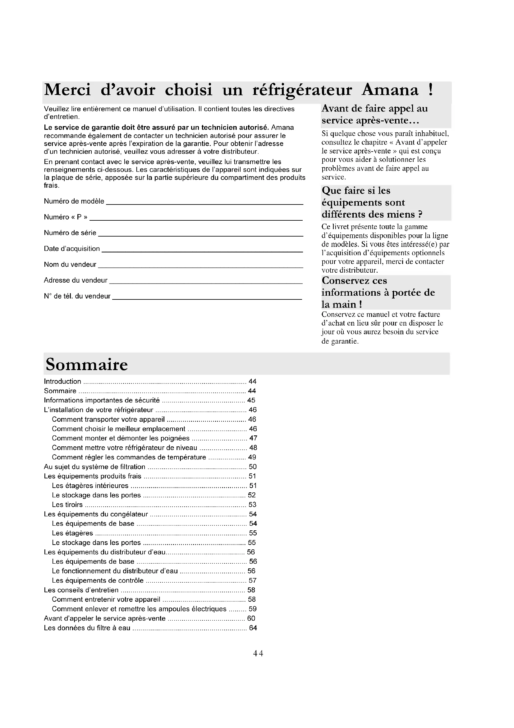 - Veuillez lire entièrement ce manuel dutilisation. Il contient toutes les directives dentretien. Le service de garantie doit être assuré par un technicien autorisé. Amana recommande également de contacter un technicien autorisé pour assurer le service après-vente après lexpiration de la garantie. Pour obtenir ladresse dun technicien autorisé, veuillez vous adresser à votre distributeur. En prenant contact avec le service après-vente, veuillez lui transmettre les renseignements ci-dessous. Les caractéristiques de lappareil sont indiquées sur la plaque de série, apposée sur la partie supérieure du compartiment des produits frais. Numéro de modèle __________________________________________________ Numéro « P » ______________________________________________________ Numéro de série ____________________________________________________ Date dacquisition ___________________________________________________ Nom du vendeur ____________________________________________________ Adresse du vendeur _________________________________________________ N° de tél. du vendeur ________________________________________________ Avant de faire appel au service après-vente Si quelque chose vous paraît inhabituel, consultez le chapitre « Avant d’appeler le service après-vente » qui est conçu pour vous aider à solutionner les problèmes avant de faire appel au service. Merci davoir choisi un réfrigérateur Amana ! Ce livret présente toute la gamme d’équipements disponibles pour la ligne de modèles. Si vous êtes intéressé(e) par l’acquisition d’équipements optionnels pour votre appareil, merci de contacter votre distributeur. Conservez ces informations à portée de la main ! Conservez ce manuel et votre facture d’achat en lieu sûr pour en disposer le jour où vous aurez besoin du service de garantie. Que faire si les équipements sont différents des miens ? Introduction p. 44