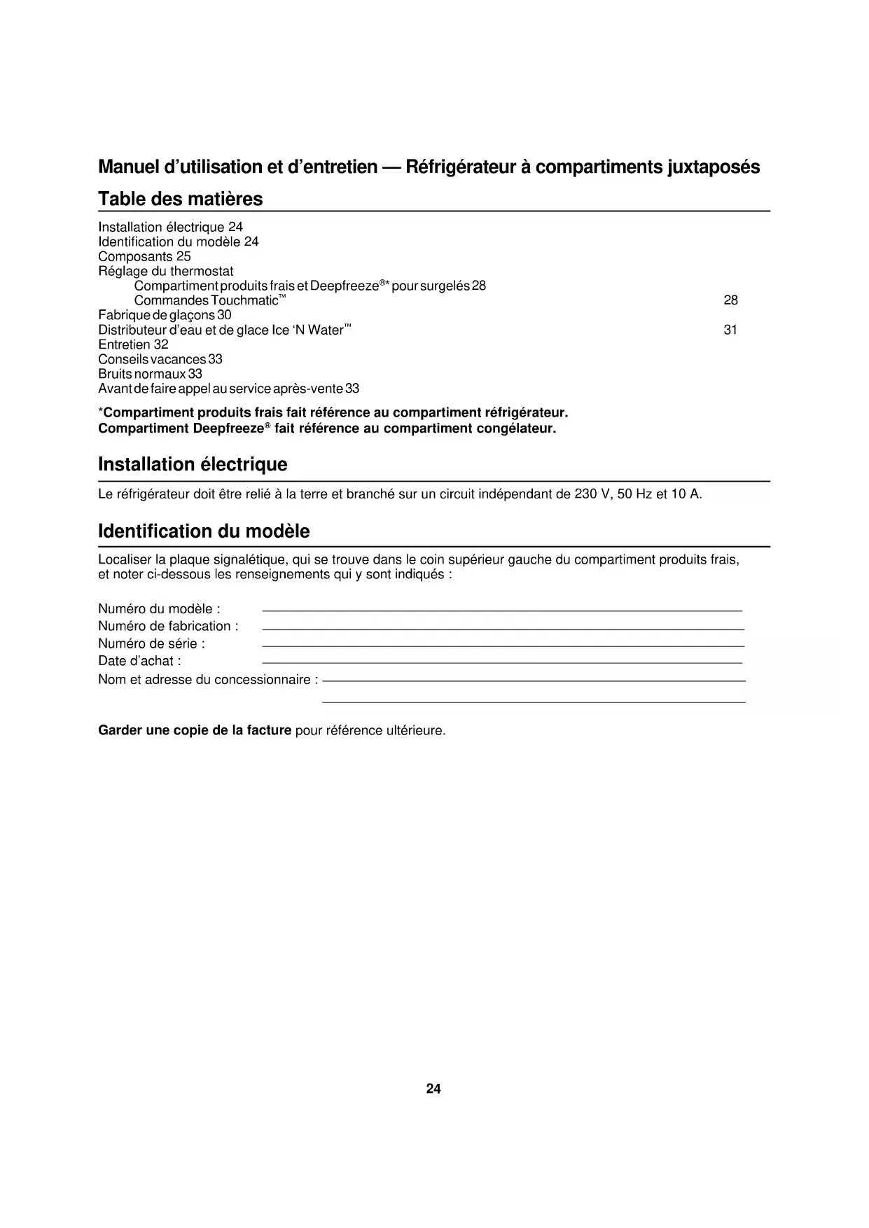 fait référence au compartiment congélateur. Installation électrique Le réfrigérateur doit être relié à la terre et branché sur un circuit indépendant de 230 V, 50 Hz et 10 A. Identification du modèle Localiser la plaque signalétique, qui se trouve dans le coin supérieur gauche du compartiment produits frais, et noter ci-dessous les renseignements qui y sont indiqués : Numéro du modèle : Numéro de fabrication : Numéro de série : Date d’achat : Nom et adresse du concessionnaire : Garder une copie de la facture pour référence ultérieure.25 Composants Compartiment produits frais (réfrigérateur)