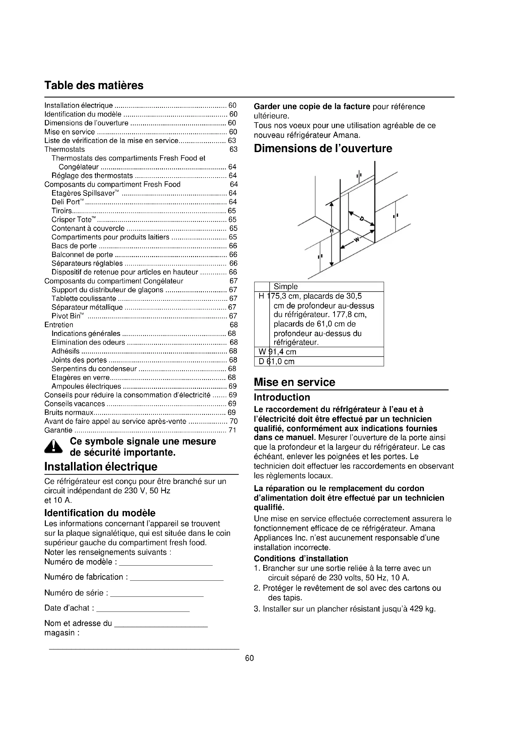 Une mise en service effectue correctement assurera le fonctionnement efficace de ce réfrigérateur. Amana Appliances Inc. n'est aucunement responsable d'une installation incorrecte.