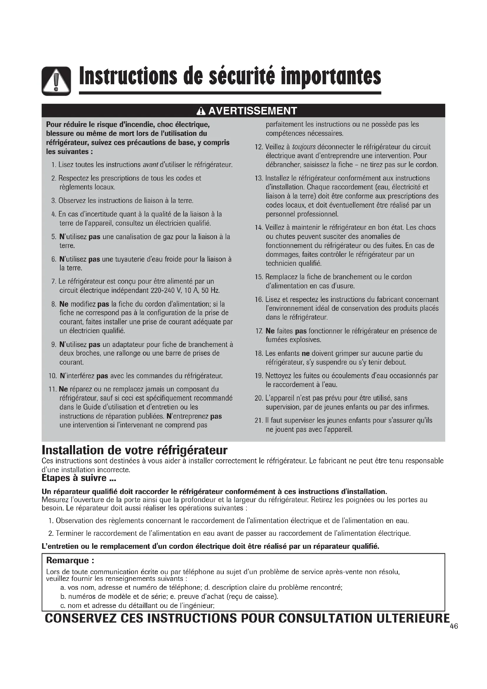 Installation de votre réfrigérateur Ces instructions sont destinées à vous aider à installer correctement le réfrigérateur. Le fabricant ne peut être tenu responsable d’une installation incorrecte. Etapes à suivre ... Un réparateur qualifié doit raccorder le réfrigérateur conformément à ces instructions d'installation. Mesurez l'ouverture de la porte ainsi que la profondeur et la largeur du réfrigérateur. Retirez les poignées ou les portes au besoin. Le réparateur doit aussi réaliser les opérations suivantes :