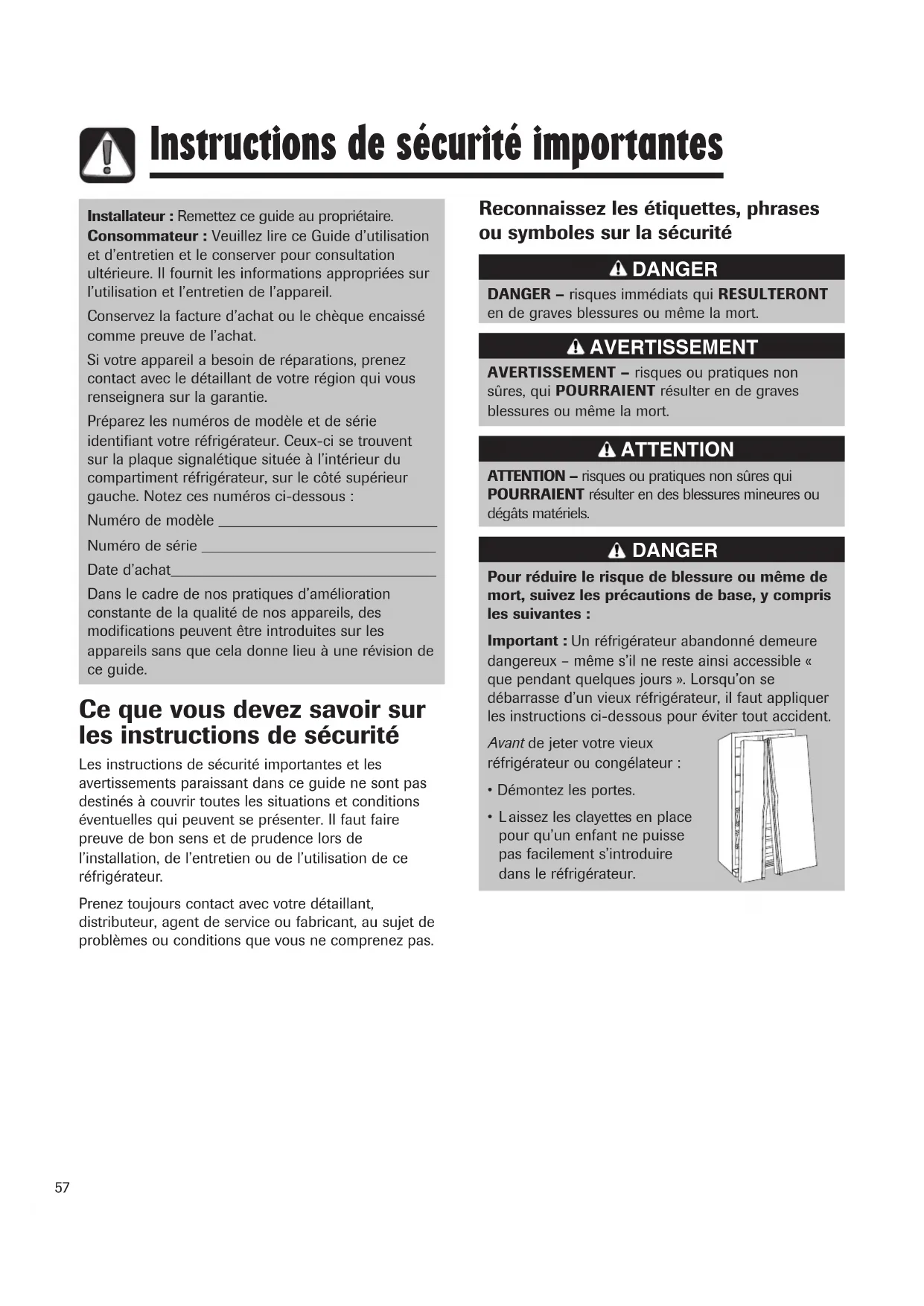 Les instructions de sécurité importantes et les avertissements paraissant dans ce guide ne sont pas destinés à couvrir toutes les situations et conditions eventuelles qui peuvent se présenter. Il faut faire preuve de bon sens et de prudence lors de l'installation, de l'entretien ou de l'utilisation de ce réfrigerateur.