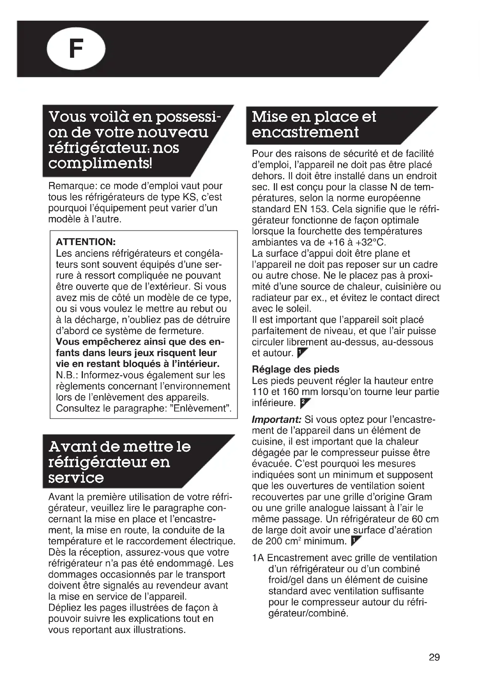 Remarque: ce mode d’emploi vaut pour tous les réfrigérateurs de type KS, c’est pourquoi l’équipement peut varier d’un modèle à l’autre. ATTENTION: Les anciens réfrigérateurs et congéla- teurs sont souvent équipés d’une ser- rure à ressort compliquée ne pouvant être ouverte que de l’extérieur. Si vous avez mis de côté un modèle de ce type, ou si vous voulez le mettre au rebut ou à la décharge, n’oubliez pas de détruire d’abord ce système de fermeture. Vous empêcherez ainsi que des en- fants dans leurs jeux risquent leur vie en restant bloqués à l’intérieur. N.B.: Informez-vous également sur les règlements concernant l’environnement lors de l’enlèvement des appareils. Consultez le paragraphe: ”Enlèvement”. Avant la première utilisation de votre réfri- gérateur, veuillez lire le paragraphe con- cernant la mise en place et l’encastre- ment, la mise en route, la conduite de la température et le raccordement électrique. Dès la réception, assurez-vous que votre réfrigérateur n’a pas été endommagé. Les dommages occasionnés par le transport doivent être signalés au revendeur avant la mise en service de l’appareil. Dépliez les pages illustrées de façon à pouvoir suivre les explications tout en vous reportant aux illustrations. Vous voilà en possessi- on de votre nouveau réfrigérateur: nos compliments! Avant de mettre le réfrigérateur en service Mise en place et encastrement