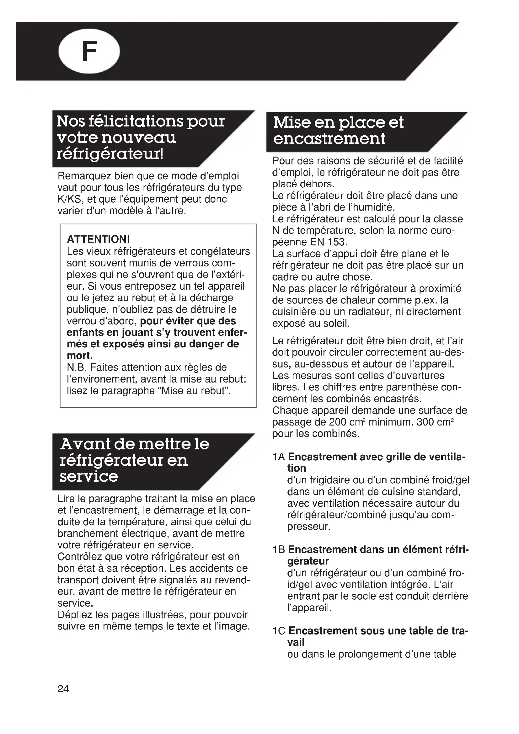 pour les combinés. 1A Encastrement avec grille de ventila- tion d’un frigidaire ou d’un combiné froid/gel dans un élément de cuisine standard, avec ventilation nécessaire autour du réfrigérateur/combiné jusqu’au com- presseur. 1B Encastrement dans un élément réfri- gérateur d’un réfrigérateur ou d’un combiné fro- id/gel avec ventilation intégrée. L’air entrant par le socle est conduit derrière l’appareil. 1C Encastrement sous une table de tra- vail ou dans le prolongement d’une table Remarquez bien que ce mode d’emploi vaut pour tous les réfrigérateurs du type K/KS, et que l’équipement peut donc varier d’un modèle à l’autre. ATTENTION! Les vieux réfrigérateurs et congélateurs sont souvent munis de verrous com- plexes qui ne s’ouvrent que de l’extéri- eur. Si vous entreposez un tel appareil ou le jetez au rebut et à la décharge publique, n’oubliez pas de détruire le verrou d’abord, pour éviter que des enfants en jouant s’y trouvent enfer- més et exposés ainsi au danger de mort. N.B. Faites attention aux règles de l’environement, avant la mise au rebut: lisez le paragraphe “Mise au rebut”. Lire le paragraphe traitant la mise en place et l’encastrement, le démarrage et la con- duite de la température, ainsi que celui du branchement électrique, avant de mettre votre réfrigérateur en service. Contrôlez que votre réfrigérateur est en bon état à sa réception. Les accidents de transport doivent être signalés au revend- eur, avant de mettre le réfrigérateur en service. Dépliez les pages illustrées, pour pouvoir suivre en même temps le texte et l’image. Nos félicitations pour votre nouveau réfrigérateur! Avant de mettre le réfrigérateur en service Mise en place et encastrementF