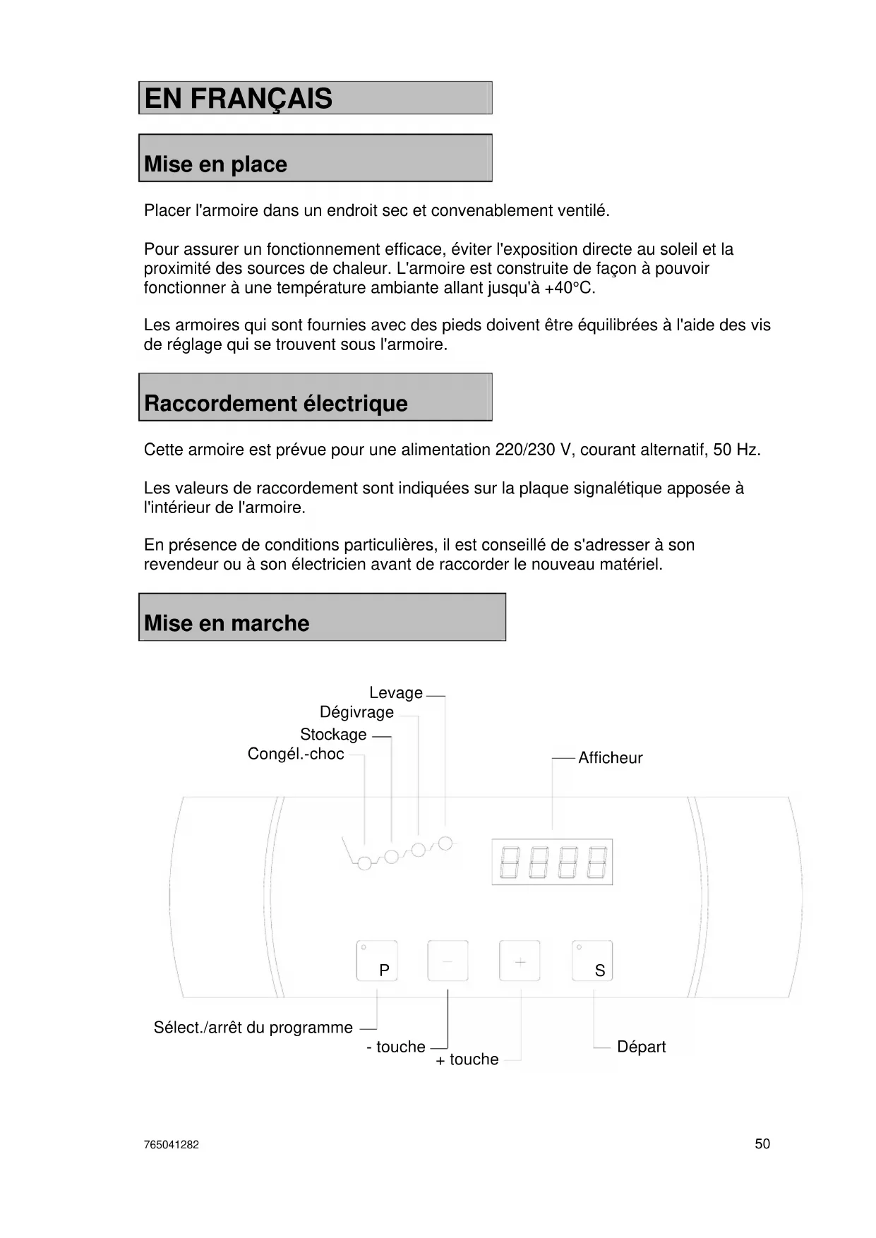 Mise en place Placer l'armoire dans un endroit sec et convenablement ventilé. Pour assurer un fonctionnement efficace, éviter l'exposition directe au soleil et la proximité des sources de chaleur. L'armoire est construite de façon à pouvoir fonctionner à une température ambiante allant jusqu'à +40°C. Les armoires qui sont fournies avec des pieds doivent être équilibrées à l'aide des vis de réglage qui se trouvent sous l'armoire. Raccordement électrique Cette armoire est prévue pour une alimentation 220/230 V, courant alternatif, 50 Hz. Les valeurs de raccordement sont indiquées sur la plaque signalétique apposée à l'intérieur de l'armoire. En présence de conditions particulières, il est conseillé de s'adresser à son revendeur ou à son électricien avant de raccorder le nouveau matériel. Mise en marche