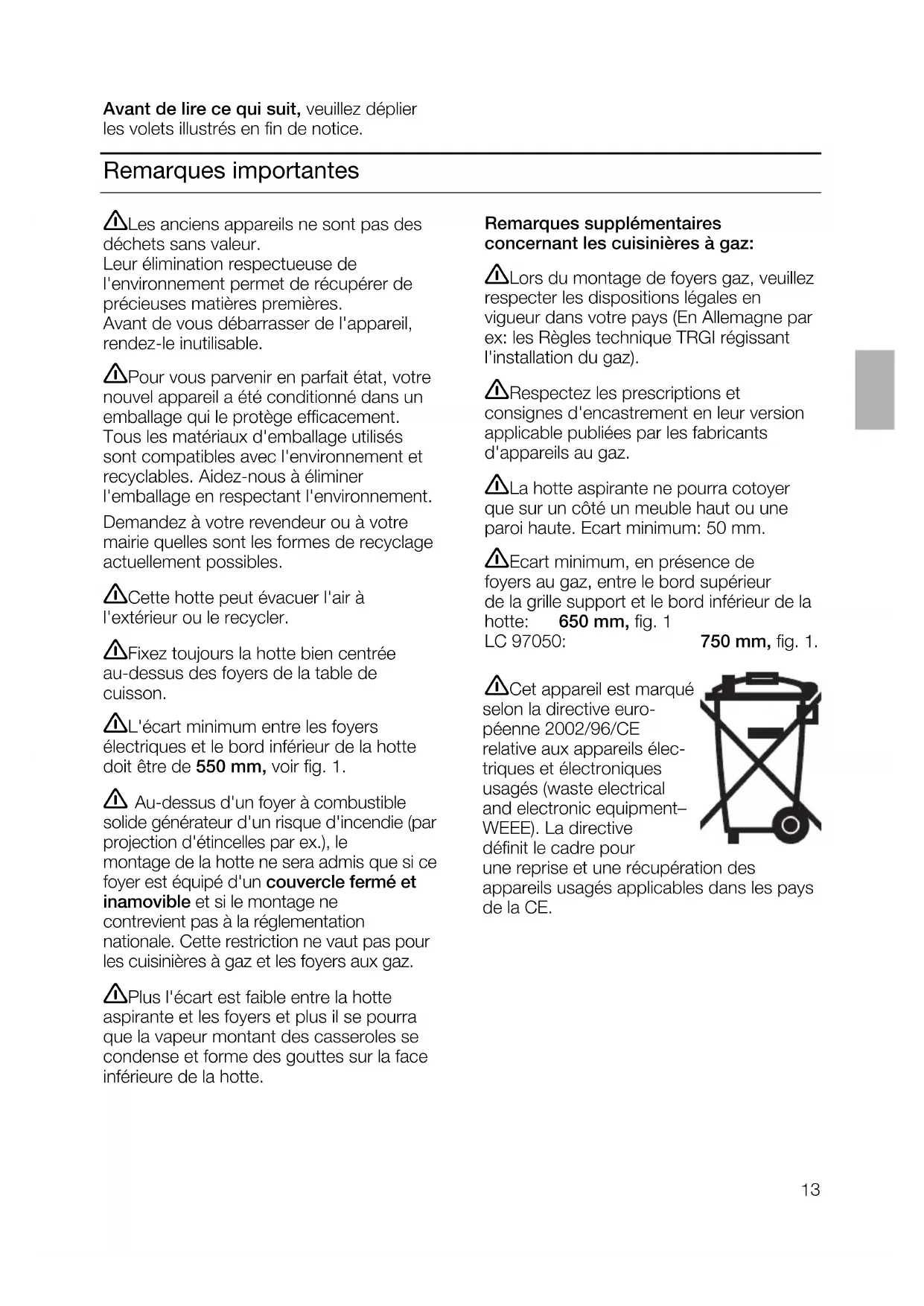 ~ goes out shortly afterwards. The electronic control system will then have been selected to exhaust air mode.13 Remarques importantes Remarques supplémentaires concernant les cuisinières à gaz: Lors du montage de foyers gaz, veuillez respecter les dispositions légales en vigueur dans votre pays (En Allemagne par ex: les Règles technique TRGI régissant l'installation du gaz). Respectez les prescriptions et consignes d'encastrement en leur version applicable publiées par les fabricants d'appareils au gaz. La hotte aspirante ne pourra cotoyer que sur un côté un meuble haut ou une paroi haute. Ecart minimum: 50 mm. Ecart minimum, en présence de foyers au gaz, entre le bord supérieur de la grille support et le bord inférieur de la hotte: 650 mm, fig. 1 LC 97050: 750 mm, fig. 1. Les anciens appareils ne sont pas des déchets sans valeur. Leur élimination respectueuse de l'environnement permet de récupérer de précieuses matières premières. Avant de vous débarrasser de l'appareil, rendez-le inutilisable. Pour vous parvenir en parfait état, votre nouvel appareil a été conditionné dans un emballage qui le protège efficacement. Tous les matériaux d'emballage utilisés sont compatibles avec l'environnement et recyclables. Aidez-nous à éliminer l'emballage en respectant l'environnement. Demandez à votre revendeur ou à votre mairie quelles sont les formes de recyclage actuellement possibles. Cette hotte peut évacuer l'air à l'extérieur ou le recycler. Fixez toujours la hotte bien centrée au-dessus des foyers de la table de cuisson. L'écart minimum entre les foyers électriques et le bord inférieur de la hotte doit être de 550 mm, voir fig. 1. Au-dessus d'un foyer à combustible solide générateur d'un risque d'incendie (par projection d'étincelles par ex.), le montage de la hotte ne sera admis que si ce foyer est équipé d'un couvercle fermé et inamovible et si le montage ne contrevient pas à la réglementation nationale. Cette restriction ne vaut pas pour les cuisinières à gaz et les foyers aux gaz. Plus l'écart est faible entre la hotte aspirante et les foyers et plus il se pourra que la vapeur montant des casseroles se condense et forme des gouttes sur la face inférieure de la hotte. Cet appareil est marqué selon la directive euro- péenne 2002/96/CE relative aux appareils élec- triques et électroniques usagés (waste electrical and electronic equipment– WEEE). La directive définit le cadre pour une reprise et une récupération des appareils usagés applicables dans les pays de la CE. Avant de lire ce qui suit, veuillez déplier les volets illustrés en fin de notice.14 Avant le montage Evacuation de l'air à l'extérieur Fig. 2 L'air vicié est évacué vers le haut par un conduit d'aération ou directement à l'air libre par traversée du mur extérieur.