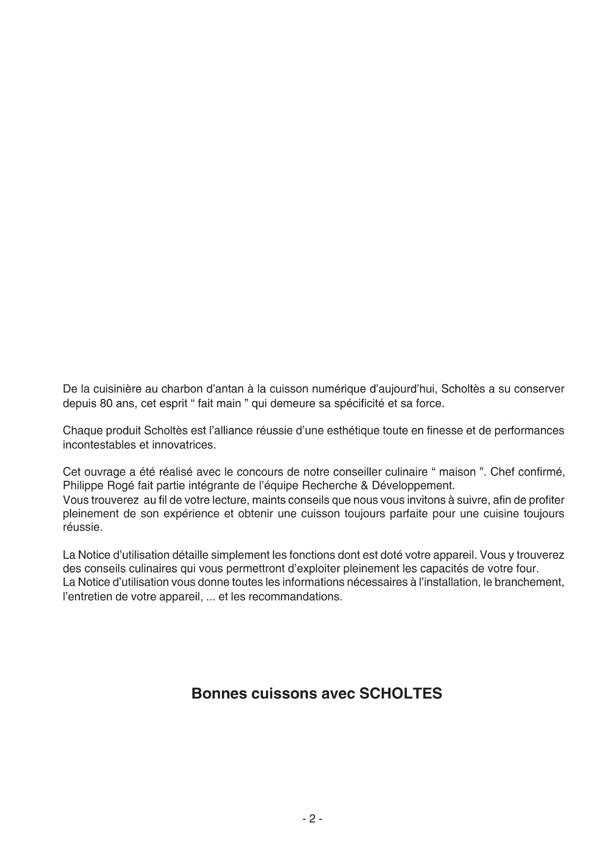 - De la cuisinière au charbon d’antan à la cuisson numérique d’aujourd’hui, Scholtès a su conserver depuis 80 ans, cet esprit “ fait main ” qui demeure sa spécificité et sa force. Chaque produit Scholtès est l’alliance réussie d’une esthétique toute en finesse et de performances incontestables et innovatrices. Cet ouvrage a été réalisé avec le concours de notre conseiller culinaire “ maison ”. Chef confirmé, Philippe Rogé fait partie intégrante de l’équipe Recherche & Développement. Vous trouverez au fil de votre lecture, maints conseils que nous vous invitons à suivre, afin de profiter pleinement de son expérience et obtenir une cuisson toujours parfaite pour une cuisine toujours réussie. La Notice d’utilisation détaille simplement les fonctions dont est doté votre appareil. Vous y trouverez des conseils culinaires qui vous permettront d’exploiter pleinement les capacités de votre four. La Notice d’utilisation vous donne toutes les informations nécessaires à l’installation, le branchement, l’entretien de votre appareil,