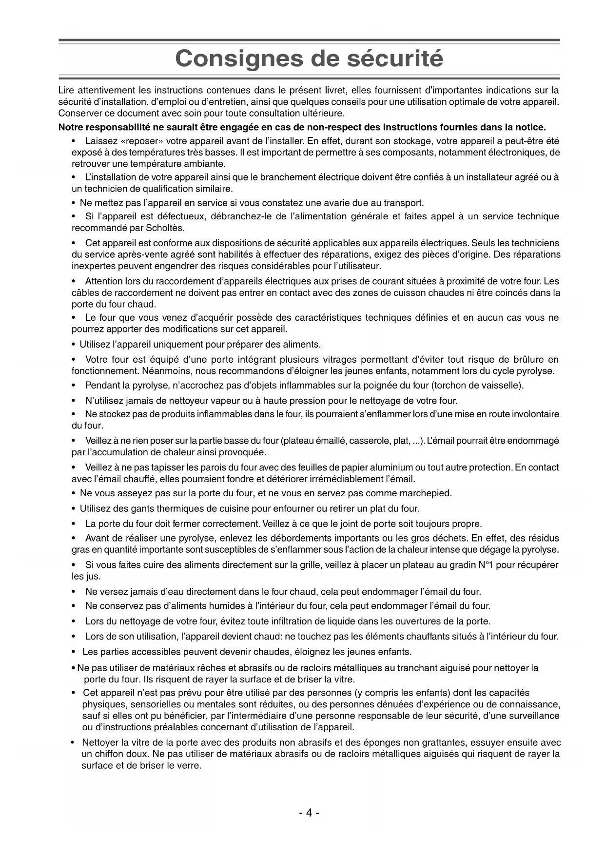 - la Notice d’utilisation détaille simplement les fonctions dont est doté votre appareil. Vous y trouverez des conseils culinaires qui vous permettront d’exploiter pleinement les capacités de votre four. Bonnes cuissons avec SCHOLTES- 3 - Sommaire Consignes de sécurité ................................................................................................................... 4 Installation & Fixation .................................................................................................................... 5 Installation .................................................................................................................................................. 5 Fixation ....................................................................................................................................................... 5 Branchement électrique ................................................................................................................ 6 Fiche technique .............................................................................................................................. 7 L’entretien de votre appareil.......................................................................................................8-9 Remarques générales ................................................................................................................................ 8 Démontage de la porte ............................................................................................................................... 8 Joint porte de four ...................................................................................................................................... 8 Extérieur de l’appareil ................................................................................................................................. 8 Couvercle en verre de la lampe du four ..................................................................................................... 8 Remplacement de l’ampoule ...................................................................................................................... 8 Les accessoires.......................................................................................................................................... 9 Le nettoyage par catalyse.............................................................................................................. 9 Le nettoyage manuel...................................................................................................................... 9 La pyrolyse ................................................................................................................................... 10 Protection de l’environnement .................................................................................................... 11 Maintenance..................................................................................................................................11 Relation consommateurs ............................................................................................................ 11 Indice ................................................................................................................................ pagina 12 Table of contents ................................................................................................................ page 22 Inhoud .......................................................................................................................... bladzijde 32 Indice ................................................................................................................................ pagina 42- 4 - Consignes de sécurité Lire attentivement les instructions contenues dans le présent livret, elles fournissent d’importantes indications sur la sécurité d’installation, d’emploi ou d’entretien, ainsi que quelques conseils pour une utilisation optimale de votre appareil. Conserver ce document avec soin pour toute consultation ultérieure. Notre responsabilité ne saurait être engagée en cas de non-respect des instructions fournies dans la notice.