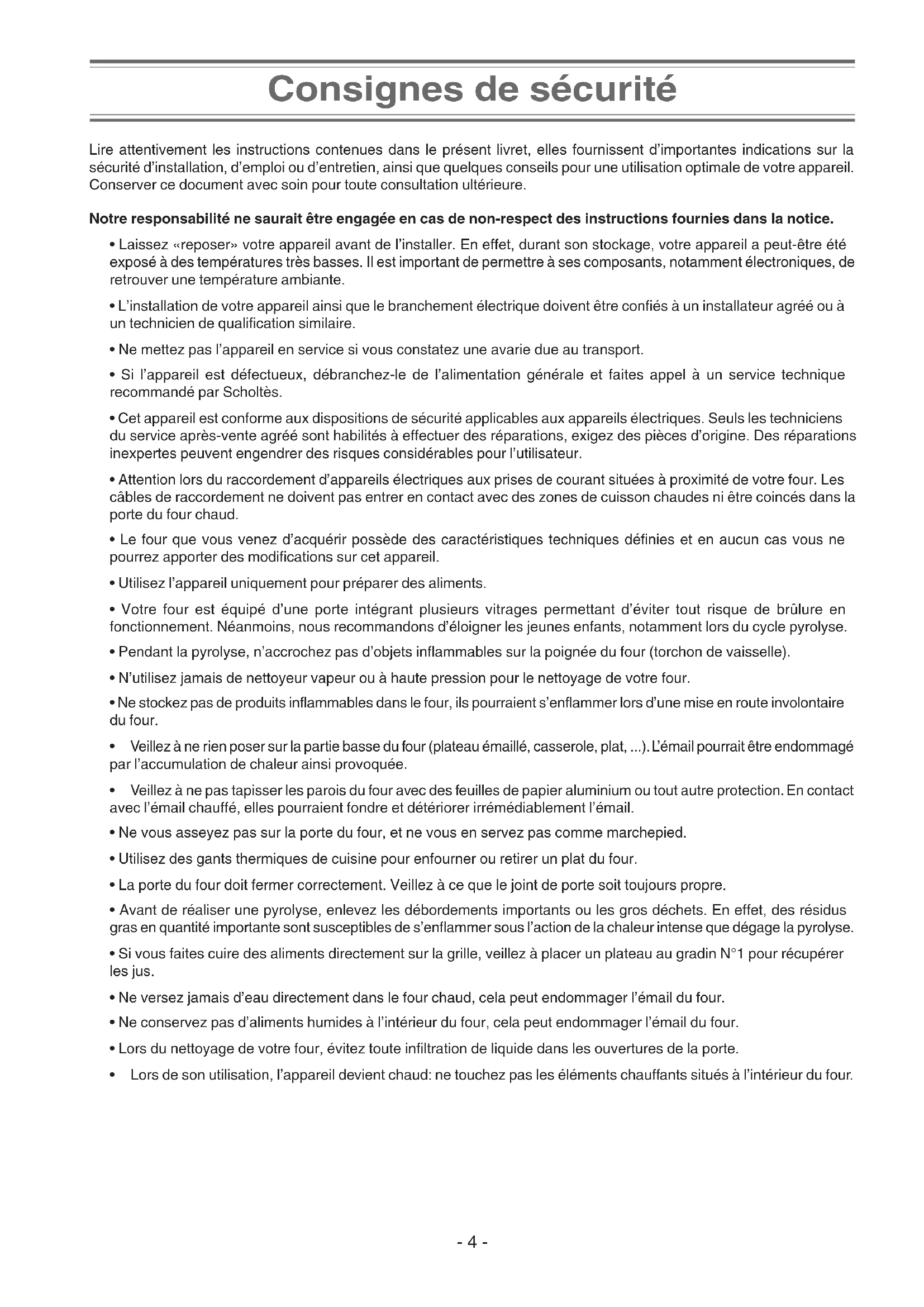 - la Notice d’utilisation détaille simplement les fonctions dont est doté votre appareil. Vous y trouverez des conseils culinaires qui vous permettront d’exploiter pleinement les capacités de votre four. Bonnes cuissons avec SCHOLTES- 3 - Sommaire Consignes de sécurité ................................................................................................................... 4 Installation & Fixation .................................................................................................................... 5 Installation .................................................................................................................................................. 5 Fixation ....................................................................................................................................................... 5 Branchement électrique ................................................................................................................ 6 Fiche technique .............................................................................................................................. 7 L’entretien de votre appareil.......................................................................................................8-9 Remarques générales ................................................................................................................................ 8 Démontage de la porte ............................................................................................................................... 8 Joint porte de four ...................................................................................................................................... 8 Extérieur de l’appareil ................................................................................................................................. 8 Couvercle en verre de la lampe du four ..................................................................................................... 8 Remplacement de l’ampoule ...................................................................................................................... 8 Les accessoires.......................................................................................................................................... 9 Le nettoyage par catalyse.............................................................................................................. 9 Le nettoyage manuel...................................................................................................................... 9 La pyrolyse ................................................................................................................................... 10 Protection de l’environnement .................................................................................................... 11 Maintenance..................................................................................................................................11 Relation consommateurs ............................................................................................................ 11 Indice ................................................................................................................................ pagina 12 Table of contents ................................................................................................................ page 22 Inhoud .......................................................................................................................... bladzijde 32 Indice ................................................................................................................................ pagina 42- 4 - Consignes de sécurité Lire attentivement les instructions contenues dans le présent livret, elles fournissent d’importantes indications sur la sécurité d’installation, d’emploi ou d’entretien, ainsi que quelques conseils pour une utilisation optimale de votre appareil. Conserver ce document avec soin pour toute consultation ultérieure. Notre responsabilité ne saurait être engagée en cas de non-respect des instructions fournies dans la notice.