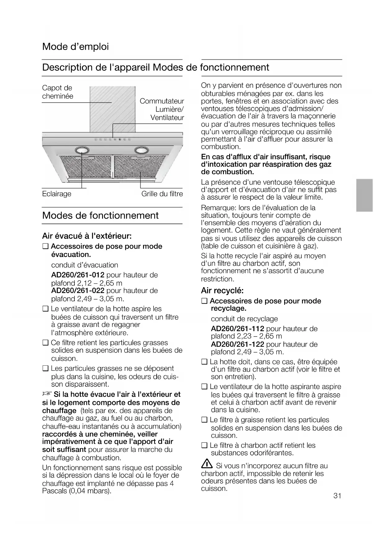 2.Description de l'appareil Modes de fonctionnement Modes de fonctionnement Air évacué à l'extérieur: ❑ Accessoires de pose pour mode évacuation. conduit d’évacuation AD260/261-012 pour hauteur de plafond 2,12 – 2,65 m AD260/261-022 pour hauteur de plafond 2,49 – 3,05 m. ❑ Le ventilateur de la hotte aspire les buées de cuisson qui traversent un filtre à graisse avant de regagner l'atmosphère extérieure. ❑ Ce filtre retient les particules grasses solides en suspension dans les buées de cuisson. ❑ Les particules grasses ne se déposent plus dans la cuisine, les odeurs de cuis- son disparaissent.