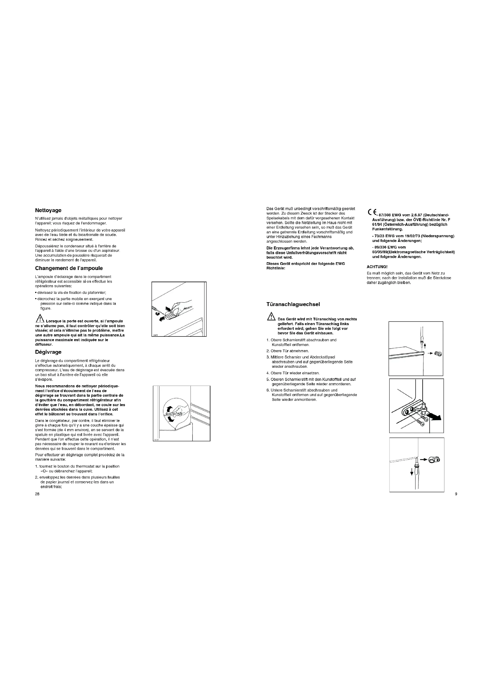 - s'il y a des traces d'eau au fond du compartiment et si l'orifice d'écoulement de l'eau de dégivrage est bouché (voir chapitre “Dégivrage”). Une fois que tous ces contrôles ont été effectués, si l'anomalie de fonctionnement continue, adressez- vous au Service Après-Vente le plus proche. Pour que l'intervention soit plus rapide, au moment de l'appel, il vaut mieux indiquer le code du modèle et le numéro d'immatriculation, qui se trouvent sur le certificat de garantie ou sur la plaque d'immatriculation placée à l'intérieur de l'appareil, à gauche et en bas. INSTALLATION Emplacement Placez de préférence votre appareil loin d’une source de chaleur (chauffage, cuisson ou rayons solaires trop intenses). Pour l’encastrement rapportez-vous aux instructions relatives ci-jointes. Branchement électrique Contrôlez, avant de brancher l’appareil, que le voltage et la fréquence indiqués sur la plaque signalétique correspondent à ceux de votre réseau. Tolérance admise: ±6%. Pour l’adaptation de l’appareil à des voltages différents, l’adjonction d’un autotransformateur d’une puissance adéquate est indispensable. Il faut absolument brancher l'appareil à une prise de terre qui marche. C'est pour cela que la prise du câble d'alimentation est munie d'un contact prévu exprès. Si la prise de courant du réseau domestique n'est pas branchée à la terre, branchez l'appareil à une prise de terre à part, conformément aux normes en vigueur, en vous adressant à un technicien spécialisé. Le fabricant décline toute responsabilité, si cette norme de prévention des accidents n'est pas respectée. -Cet appareil est conforme aux Directives Communautaires suivantes: - 87/308 CEE du 2.6.87 concernant la suppression des interférences radio-électriques .- 73/23 CEE 19/02/73 (Basse Tension) et modifications successives; - 89/336 CEE 03/05/89 (Compatibilité Electromagnétique) et modifications successives. Important: L’appareil doit pouvoir être débranché du secteur ; il est donc nécessaire que la fiche reste accessible une fois que l’installation est terminée. autres moyens artificiels pour accélérer le dégivrage, à part ceux préconisés. L’élévation de température des denrées congelées peut diminuer leur durée de conservation.9 Das Gerät muß unbedingt vorschriftsmäßig geerdet werden. Zu diesem Zweck ist der Stecker des Speisekabels mit dem dafür vorgesehenen Kontakt versehen. Sollte die Netzleitung im Haus nicht mit einer Erdleitung versehen sein, so muß das Gerät an eine getrennte Erdleitung vorschriftsmäßig und unter Hinzuziehung eines Fachmanns angeschlossen werden. Die Erzeugerfirma lehnt jede Verantwortung ab, falls diese Unfallverhütungsvorschrift nicht beachtet wird. Dieses Gerät entspricht der folgende EWG Richtlinie: - 87/308 EWG vom 2.6.87 (Deutschland- Ausführung) bzw. der ÖVE-Richtlinie Nr. F 61/84 (Österreich-Ausführung) bezüglich Funkentstörung. - 73/23 EWG vom 19/02/73 (Niederspannung) und folgende Änderungen; - 89/336 EWG vom 03/05/89(Elektromagnetische Verträglichkeit) und folgende Änderungen. ACHTUNG! Es muß möglich sein, das Gerät vom Netz zu trennen; nach der Installation muß die Steckdose daher zugänglich bleiben. Türanschlagwechsel Das Gerät wird mit Türanschlag von rechts geliefert. Falls einen Türanschlag links erfordert wird; gehen Sie wie folgt vor bevor Sie das Gerät einbauen.