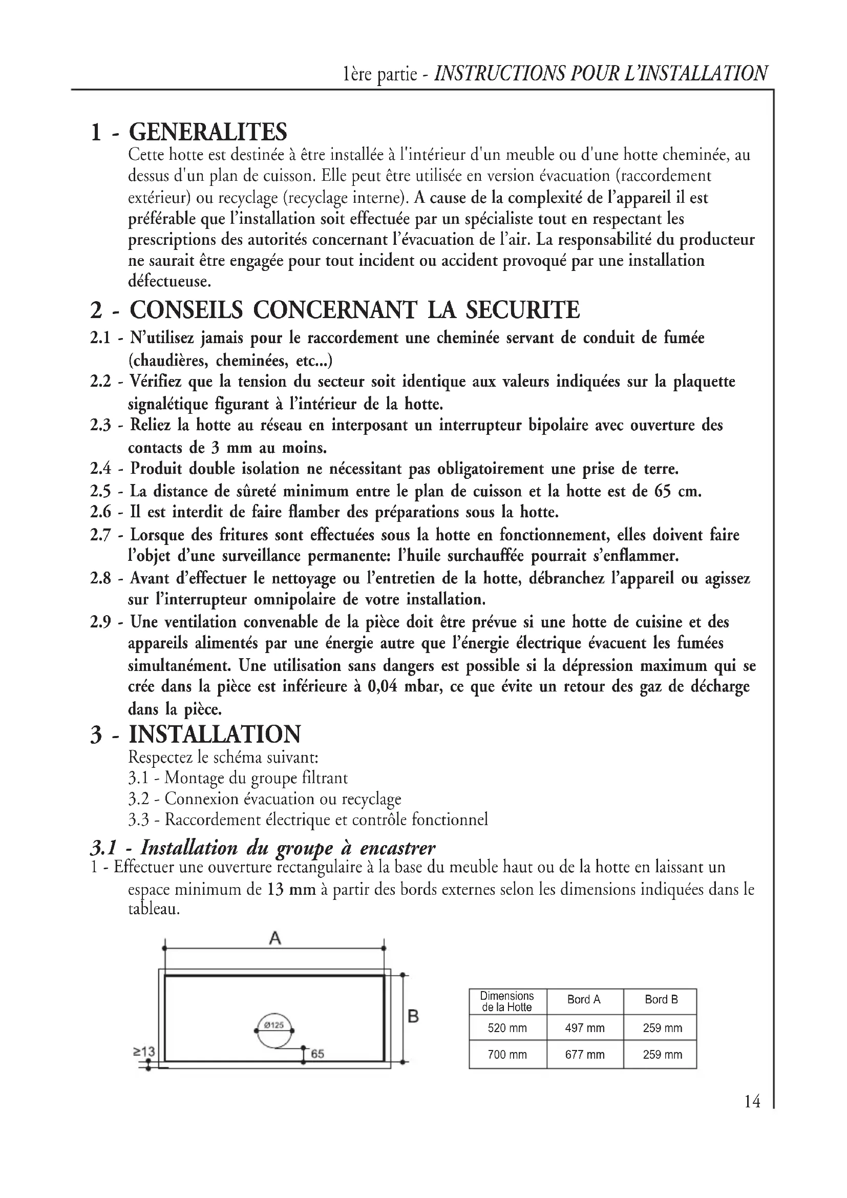 espace minimum de 13 mm à partir des bords externes selon les dimensions indiquées dans le tableau. 1ère partie - INSTRUCTIONS POUR L’INSTALLATION 520 mm 700 mm Bord A 497 mm 677 mm Bord B 259 mm 259 mm Dimensions de la Hotte15