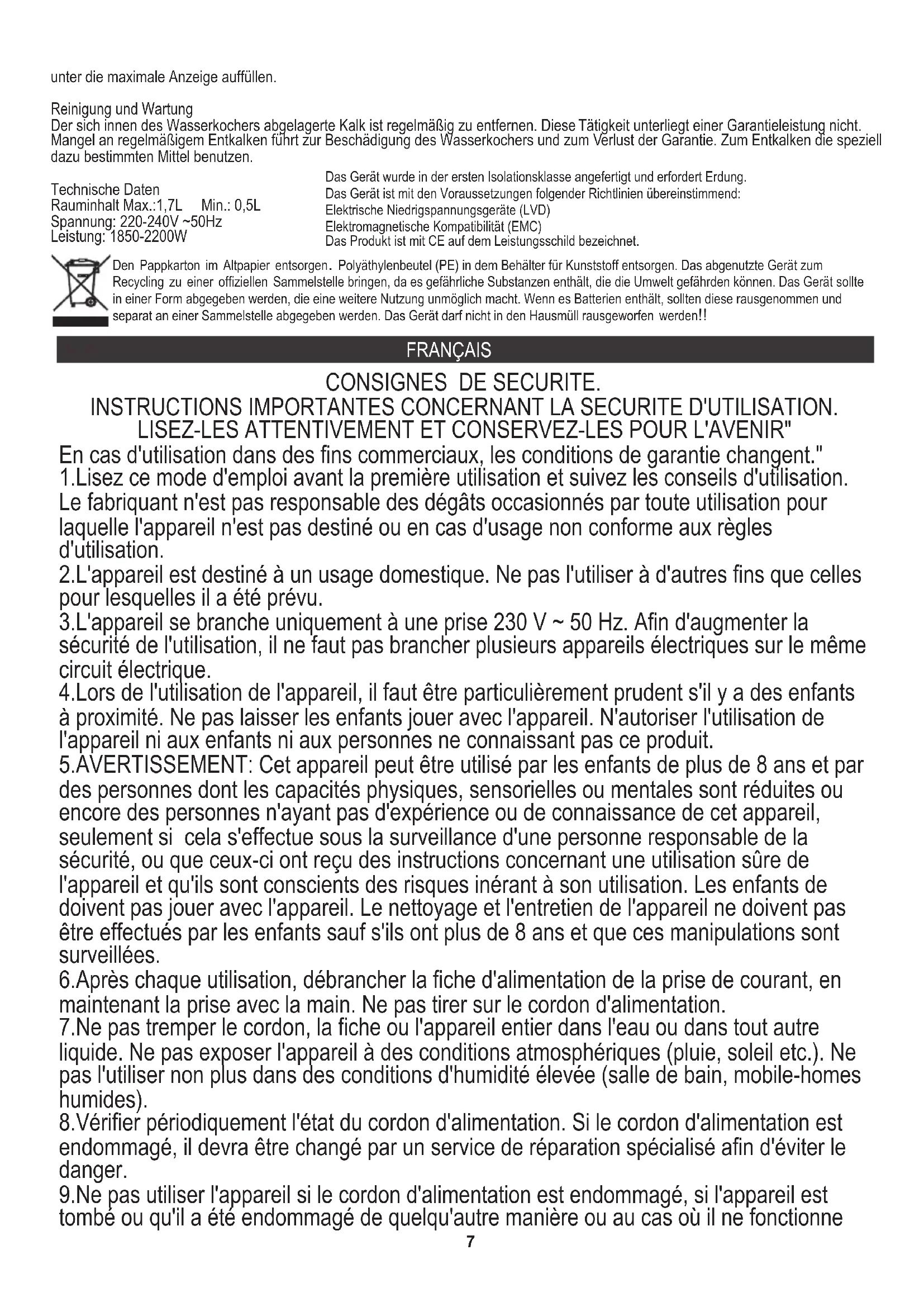 En cas d'utilisation dans des fins commerciaux, les conditions de garantie changent." 1.Lisez ce mode d'emploi avant la première utilisation et suivez les conseils d'utilisation. Le fabriquant n'est pas responsable des dégâts occasionnés par toute utilisation pour laquelle l'appareil n'est pas destiné ou en cas d'usage non conforme aux règles d'utilisation. 2.L'appareil est destiné à un usage domestique. Ne pas l'utiliser à d'autres fins que celles pour lesquelles il a été prévu. 3.L'appareil se branche uniquement à une prise 230 V ~ 50 Hz. Afin d'augmenter la sécurité de l'utilisation, il ne faut pas brancher plusieurs appareils électriques sur le même circuit électrique. 4.Lors de l'utilisation de l'appareil, il faut être particulièrement prudent s'il y a des enfants à proximité. Ne pas laisser les enfants jouer avec l'appareil. N'autoriser l'utilisation de l'appareil ni aux enfants ni aux personnes ne connaissant pas ce produit. 5.AVERTISSEMENT: Cet appareil peut être utilisé par les enfants de plus de 8 ans et par des personnes dont les capacités physiques, sensorielles ou mentales sont réduites ou encore des personnes n'ayant pas d'expérience ou de connaissance de cet appareil, seulement si cela s'effectue sous la surveillance d'une personne responsable de la sécurité, ou que ceux-ci ont reçu des instructions concernant une utilisation sûre de l'appareil et qu'ils sont conscients des risques inérant à son utilisation. Les enfants de doivent pas jouer avec l'appareil. Le nettoyage et l'entretien de l'appareil ne doivent pas être effectués par les enfants sauf s'ils ont plus de 8 ans et que ces manipulations sont surveillées. 6.Après chaque utilisation, débrancher la fiche d'alimentation de la prise de courant, en maintenant la prise avec la main. Ne pas tirer sur le cordon d'alimentation. 7.Ne pas tremper le cordon, la fiche ou l'appareil entier dans l'eau ou dans tout autre liquide. Ne pas exposer l'appareil à des conditions atmosphériques (pluie, soleil etc.). Ne pas l'utiliser non plus dans des conditions d'humidité élevée (salle de bain, mobile-homes humides). 8.Vérifier périodiquement l'état du cordon d'alimentation. Si le cordon d'alimentation est endommagé, il devra être changé par un service de réparation spécialisé afin d'éviter le danger. 9.Ne pas utiliser l'appareil si le cordon d'alimentation est endommagé, si l'appareil est tombé ou qu'il a été endommagé de quelqu'autre manière ou au cas où il ne fonctionne unter die maximale Anzeige auffüllen. Reinigung und Wartung Der sich innen des Wasserkochers abgelagerte Kalk ist regelmäßig zu entfernen. Diese Tätigkeit unterliegt einer Garantieleistung nicht. Mangel an regelmäßigem Entkalken führt zur Beschädigung des Wasserkochers und zum Verlust der Garantie. Zum Entkalken die speziell dazu bestimmten Mittel benutzen. Technische Daten Rauminhalt Max.:1,7L Min.: 0,5L Spannung: 220-240V ~50Hz Leistung: 1850-2200Wpas correctement. Ne pas réparer l'appareil soi-même car cela présente un risque d'électrocution. Un appareil endommagé doit être remis chez un professionnel pour vérification ou réparation. Toute réparation doit être effectuée par un service de réparation agréé. Une réparation mal effectuée peut constituer un danger non négligeable pour l'utilisateur.