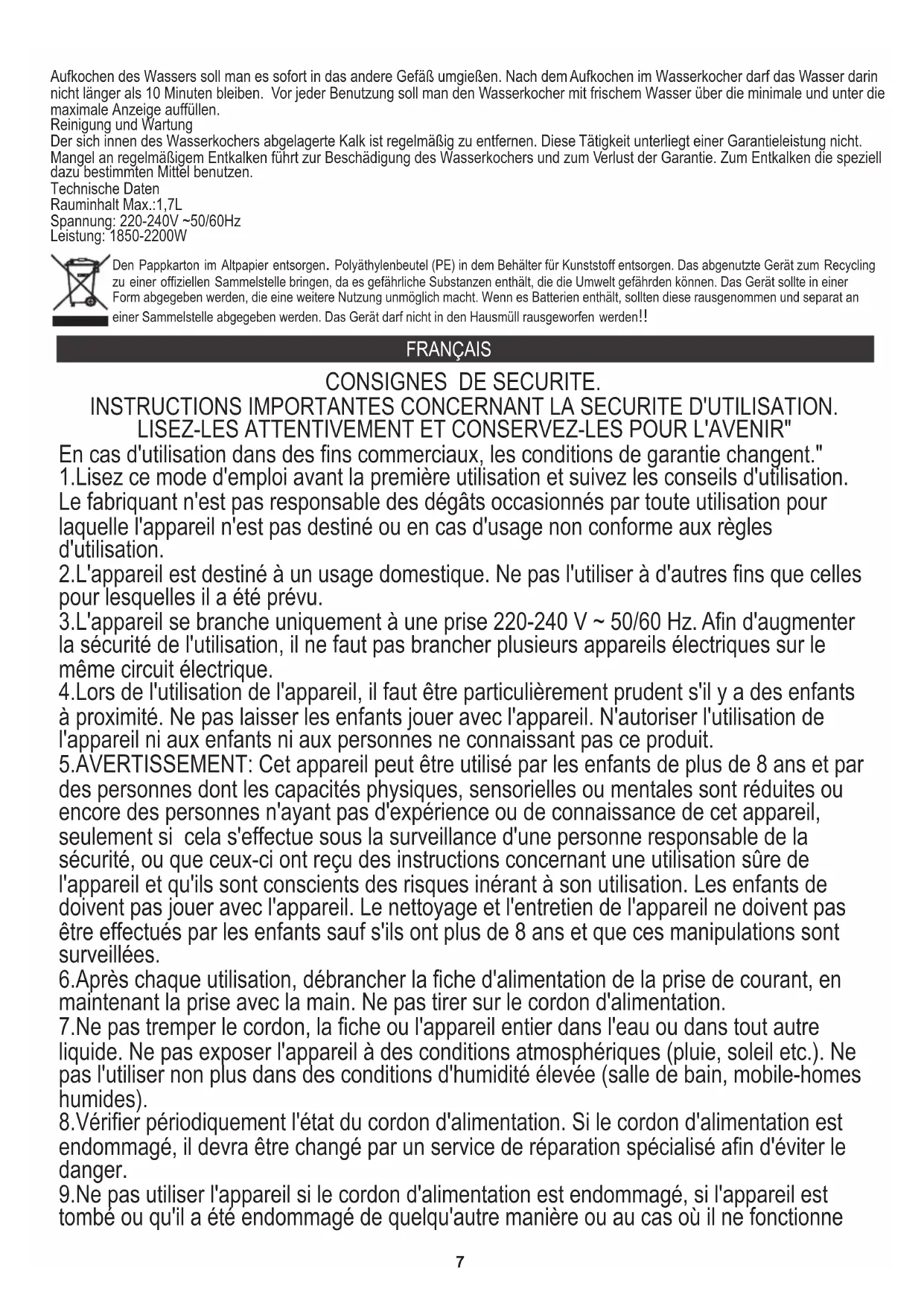 Puissance: 1850-2200W Capacité max: 1,7L Il faut enlever régulièrement le dépôt calcaire. Cette manipulation n'est pas couverte par la garantie. A défaut d'un détartrage régulier, cela entraînera des dégâts ainsi que la perte de la garantie. Pour détartrer, utiliser des produits prévus expressément à cet effet. Fiche technique: Respect de l'environnement. Nous vous prions de bien vouloir trier les emballages en carton ainsi que les sachets plastiques (en polyéthylène). L'appareil usagé ne doit pas être jeté à la poubelle mais remis au point de collecte prévu à cet effet car il contient des éléments pouvant être nocifs pour l'environnement. L'appareil électrique doit être remis de manière à limiter au maximum une éventuelle utilisation ultérieure. Si l'appareil contient des piles, il faut les retirer et les remettre à un autre point de collecte. Ne pas jeter l'appareil dans une poubelle de déchets ménagers !!! ESPAÑOL 5.ADVERTENCIA: Este dispositivo puede ser utilizado por niños mayores de 8 años y personas con capacidades físicas, sensoriales o mentaleslimitadas, sin experiencia y conocimiento, si lo hacen bajo la supervisión de una persona responsable de su seguridad y que tenga información sobre el uso seguro del dispositivo y sea consciente de los Si usa el aparato con fines comerciales, las condiciones de la garantía cambiarán. 2.El equipo sirve única y exclusivamente para el uso doméstico. No lo uses para otros fines que los indicados.
