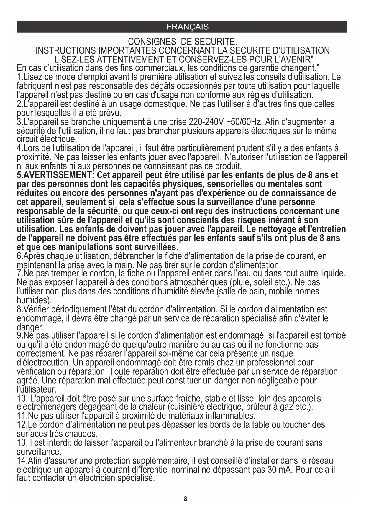 Den Pappkarton im Altpapier entsorgen. Polyäthylenbeutel (PE) in dem Behälter für Kunststoff entsorgen. Das abgenutzte Gerät zum Recycling zu einer offiziellen Sammelstelle bringen, da es gefährliche Substanzen enthält, die die Umwelt gefährden können. Das Gerät sollte in einer Form abgegeben werden, die eine weitere Nutzung unmöglich macht. Wenn es Batterien enthält, sollten diese rausgenommen und separat an einer Sammelstelle abgegeben werden. Das Gerät darf nicht in den Hausmüll rausgeworfen werden!! FRANÇAIS8 2.L'appareil est destiné à un usage domestique. Ne pas l'utiliser à d'autres fins que celles pour lesquelles il a été prévu. 3.L'appareil se branche uniquement à une prise 220-240V ~50/60Hz. Afin d'augmenter la sécurité de l'utilisation, il ne faut pas brancher plusieurs appareils électriques sur le même circuit électrique. 4.Lors de l'utilisation de l'appareil, il faut être particulièrement prudent s'il y a des enfants à proximité. Ne pas laisser les enfants jouer avec l'appareil. N'autoriser l'utilisation de l'appareil ni aux enfants ni aux personnes ne connaissant pas ce produit. En cas d'utilisation dans des fins commerciaux, les conditions de garantie changent." INSTRUCTIONS IMPORTANTES CONCERNANT LA SECURITE D'UTILISATION. 5.AVERTISSEMENT: Cet appareil peut être utilisé par les enfants de plus de 8 ans et par des personnes dont les capacités physiques, sensorielles ou mentales sont réduites ou encore des personnes n'ayant pas d'expérience ou de connaissance de cet appareil, seulement si cela s'effectue sous la surveillance d'une personne responsable de la sécurité, ou que ceux-ci ont reçu des instructions concernant une utilisation sûre de l'appareil et qu'ils sont conscients des risques inérant à son utilisation. Les enfants de doivent pas jouer avec l'appareil. Le nettoyage et l'entretien de l'appareil ne doivent pas être effectués par les enfants sauf s'ils ont plus de 8 ans et que ces manipulations sont surveillées. 6.Après chaque utilisation, débrancher la fiche d'alimentation de la prise de courant, en maintenant la prise avec la main. Ne pas tirer sur le cordon d'alimentation. 7.Ne pas tremper le cordon, la fiche ou l'appareil entier dans l'eau ou dans tout autre liquide. Ne pas exposer l'appareil à des conditions atmosphériques (pluie, soleil etc.). Ne pas l'utiliser non plus dans des conditions d'humidité élevée (salle de bain, mobile-homes humides). 8.Vérifier périodiquement l'état du cordon d'alimentation. Si le cordon d'alimentation est endommagé, il devra être changé par un service de réparation spécialisé afin d'éviter le danger. 9.Ne pas utiliser l'appareil si le cordon d'alimentation est endommagé, si l'appareil est tombé ou qu'il a été endommagé de quelqu'autre manière ou au cas où il ne fonctionne pas correctement. Ne pas réparer l'appareil soi-même car cela présente un risque d'électrocution. Un appareil endommagé doit être remis chez un professionnel pour vérification ou réparation. Toute réparation doit être effectuée par un service de réparation agréé. Une réparation mal effectuée peut constituer un danger non négligeable pour l'utilisateur. CONSIGNES DE SECURITE.