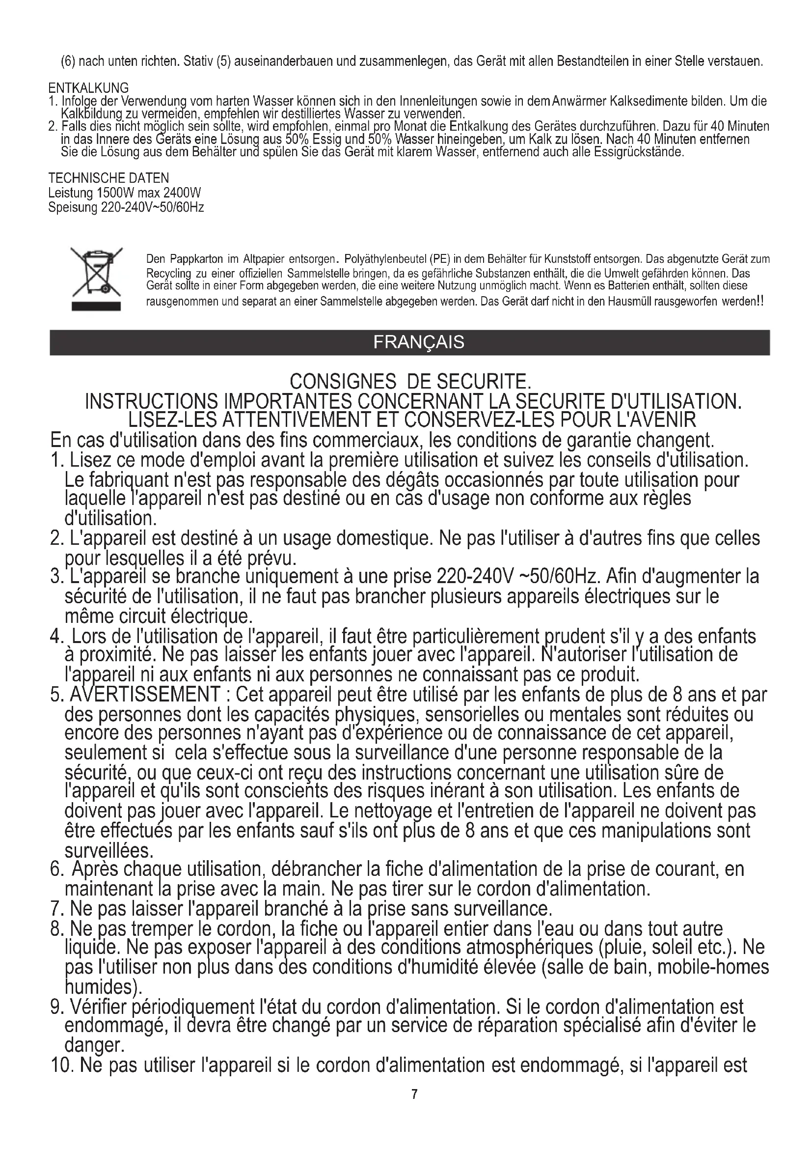 10. Après avoir terminé le repassage, éteignez l'appareil (7), retirez la fiche de la prise secteur, tournez le tuyau (4) autour de la manche (5) et placez le diffuseur de vapeur (2) dans la poignée (3). 11. Si l'appareil ne sera pas utilisé pendant une longue période de temps il doit être vidé complètement de l'eau. Pour ce faire, retirez le réservoir d'eau et videz-le, rincez et laissez sécher. Laver ensuite l'appareil - verser l'eau claire à travers l'ouverture d'entrée près du raccord du tuyau (6), puis videz le réservoir en tournant l'appareil l'ouverture (6) vers le bas. Dévissez la manche (5) et rangez-la avec tous les éléments dans un lieu de stockage. DÉTARTRAGE 1. À la suite de l'utilisation de l'eau dure les dépôts de tartre peuvent se former dans les conduits intérieurs et sur la chauffeuse. Pour minimiser l'entartrage nous vous recommandons d'utiliser de l'eau distillée. 2. Si ce n'est pas possible, il est recommandé d'effectuer le détartrage une fois par mois en versant dans l'appareil pour 40 minutes une solution de 50% de vinaigre et 50% d'eau pour dissoudre le tartre. Après 40 minutes, videz le réservoir et rincez-le à l'eau claire, en enlevant toute trace de vinaigre. CARACTÉRISTIQUES TECHNIQUES: Puissance: 1500W max: 2400W Alimentation: 220-240V~50/60Hz Respect de l'environnement. Nous vous prions de bien vouloir trier les emballages en carton ainsi que les sachets plastiques (en polyéthylène). L'appareil usagé ne doit pas être jeté à la poubelle mais remis au point de collecte prévu à cet effet car il contient des éléments pouvant être nocifs pour l'environnement. L'appareil électrique doit être remis de manière à limiter au maximum une éventuelle utilisation ultérieure. Si l'appareil contient des piles, il faut les retirer et les remettre à un autre point de collecte. Ne pas jeter l'appareil dans une poubelle de déchets ménagers !!! ESPAÑOL