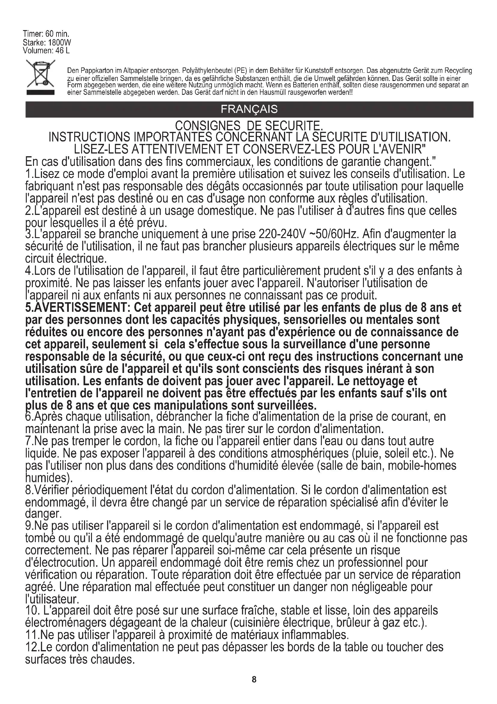 3.L'appareil se branche uniquement à une prise 220-240V ~50/60Hz. Afin d'augmenter la sécurité de l'utilisation, il ne faut pas brancher plusieurs appareils électriques sur le même circuit électrique. 11.Ne pas utiliser l'appareil à proximité de matériaux inflammables. 12.Le cordon d'alimentation ne peut pas dépasser les bords de la table ou toucher des surfaces très chaudes. 1.Lisez ce mode d'emploi avant la première utilisation et suivez les conseils d'utilisation. Le fabriquant n'est pas responsable des dégâts occasionnés par toute utilisation pour laquelle l'appareil n'est pas destiné ou en cas d'usage non conforme aux règles d'utilisation. 5.AVERTISSEMENT: Cet appareil peut être utilisé par les enfants de plus de 8 ans et par des personnes dont les capacités physiques, sensorielles ou mentales sont réduites ou encore des personnes n'ayant pas d'expérience ou de connaissance de cet appareil, seulement si cela s'effectue sous la surveillance d'une personne responsable de la sécurité, ou que ceux-ci ont reçu des instructions concernant une utilisation sûre de l'appareil et qu'ils sont conscients des risques inérant à son utilisation. Les enfants de doivent pas jouer avec l'appareil. Le nettoyage et l'entretien de l'appareil ne doivent pas être effectués par les enfants sauf s'ils ont plus de 8 ans et que ces manipulations sont surveillées. 7.Ne pas tremper le cordon, la fiche ou l'appareil entier dans l'eau ou dans tout autre liquide. Ne pas exposer l'appareil à des conditions atmosphériques (pluie, soleil etc.). Ne pas l'utiliser non plus dans des conditions d'humidité élevée (salle de bain, mobile-homes humides). 2.L'appareil est destiné à un usage domestique. Ne pas l'utiliser à d'autres fins que celles pour lesquelles il a été prévu. 9.Ne pas utiliser l'appareil si le cordon d'alimentation est endommagé, si l'appareil est tombé ou qu'il a été endommagé de quelqu'autre manière ou au cas où il ne fonctionne pas correctement. Ne pas réparer l'appareil soi-même car cela présente un risque d'électrocution. Un appareil endommagé doit être remis chez un professionnel pour vérification ou réparation. Toute réparation doit être effectuée par un service de réparation agréé. Une réparation mal effectuée peut constituer un danger non négligeable pour l'utilisateur. INSTRUCTIONS IMPORTANTES CONCERNANT LA SECURITE D'UTILISATION. 4.Lors de l'utilisation de l'appareil, il faut être particulièrement prudent s'il y a des enfants à proximité. Ne pas laisser les enfants jouer avec l'appareil. N'autoriser l'utilisation de l'appareil ni aux enfants ni aux personnes ne connaissant pas ce produit.ESPAÑOL