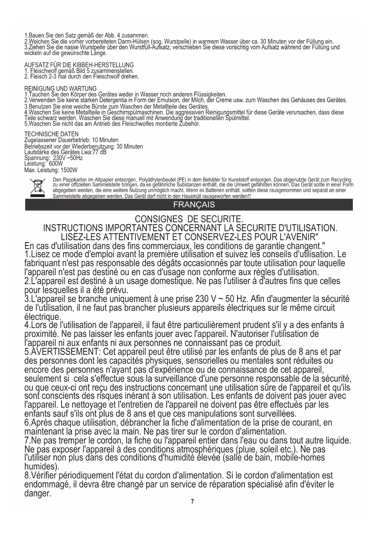 En cas d'utilisation dans des fins commerciaux, les conditions de garantie changent." 1.Lisez ce mode d'emploi avant la première utilisation et suivez les conseils d'utilisation. Le fabriquant n'est pas responsable des dégâts occasionnés par toute utilisation pour laquelle l'appareil n'est pas destiné ou en cas d'usage non conforme aux règles d'utilisation. 2.L'appareil est destiné à un usage domestique. Ne pas l'utiliser à d'autres fins que celles pour lesquelles il a été prévu. 3.L'appareil se branche uniquement à une prise 230 V ~ 50 Hz. Afin d'augmenter la sécurité de l'utilisation, il ne faut pas brancher plusieurs appareils électriques sur le même circuit électrique. 4.Lors de l'utilisation de l'appareil, il faut être particulièrement prudent s'il y a des enfants à proximité. Ne pas laisser les enfants jouer avec l'appareil. N'autoriser l'utilisation de l'appareil ni aux enfants ni aux personnes ne connaissant pas ce produit. 5.AVERTISSEMENT: Cet appareil peut être utilisé par les enfants de plus de 8 ans et par des personnes dont les capacités physiques, sensorielles ou mentales sont réduites ou encore des personnes n'ayant pas d'expérience ou de connaissance de cet appareil, seulement si cela s'effectue sous la surveillance d'une personne responsable de la sécurité, ou que ceux-ci ont reçu des instructions concernant une utilisation sûre de l'appareil et qu'ils sont conscients des risques inérant à son utilisation. Les enfants de doivent pas jouer avec l'appareil. Le nettoyage et l'entretien de l'appareil ne doivent pas être effectués par les enfants sauf s'ils ont plus de 8 ans et que ces manipulations sont surveillées. 6.Après chaque utilisation, débrancher la fiche d'alimentation de la prise de courant, en maintenant la prise avec la main. Ne pas tirer sur le cordon d'alimentation. 7.Ne pas tremper le cordon, la fiche ou l'appareil entier dans l'eau ou dans tout autre liquide. Ne pas exposer l'appareil à des conditions atmosphériques (pluie, soleil etc.). Ne pas l'utiliser non plus dans des conditions d'humidité élevée (salle de bain, mobile-homes humides). 8.Vérifier périodiquement l'état du cordon d'alimentation. Si le cordon d'alimentation est endommagé, il devra être changé par un service de réparation spécialisé afin d'éviter le danger.