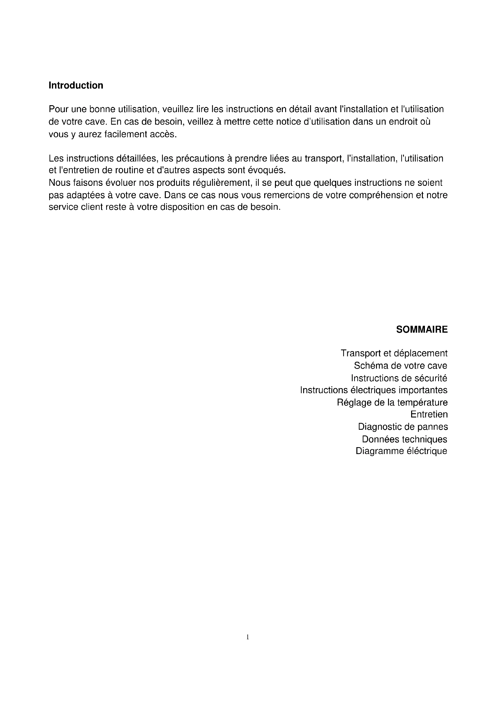 Introduction Pour une bonne utilisation, veuillez lire les instructions en détail avant l'installation et l'utilisation de votre cave. En cas de besoin, veillez à mettre cette notice d’utilisation dans un endroit où vous y aurez facilement accès. Les instructions détaillées, les précautions à prendre liées au transport, l'installation, l'utilisation et l'entretien de routine et d'autres aspects sont évoqués. Nous faisons évoluer nos produits régulièrement, il se peut que quelques instructions ne soient pas adaptées à votre cave. Dans ce cas nous vous remercions de votre compréhension et notre service client reste à votre disposition en cas de besoin.