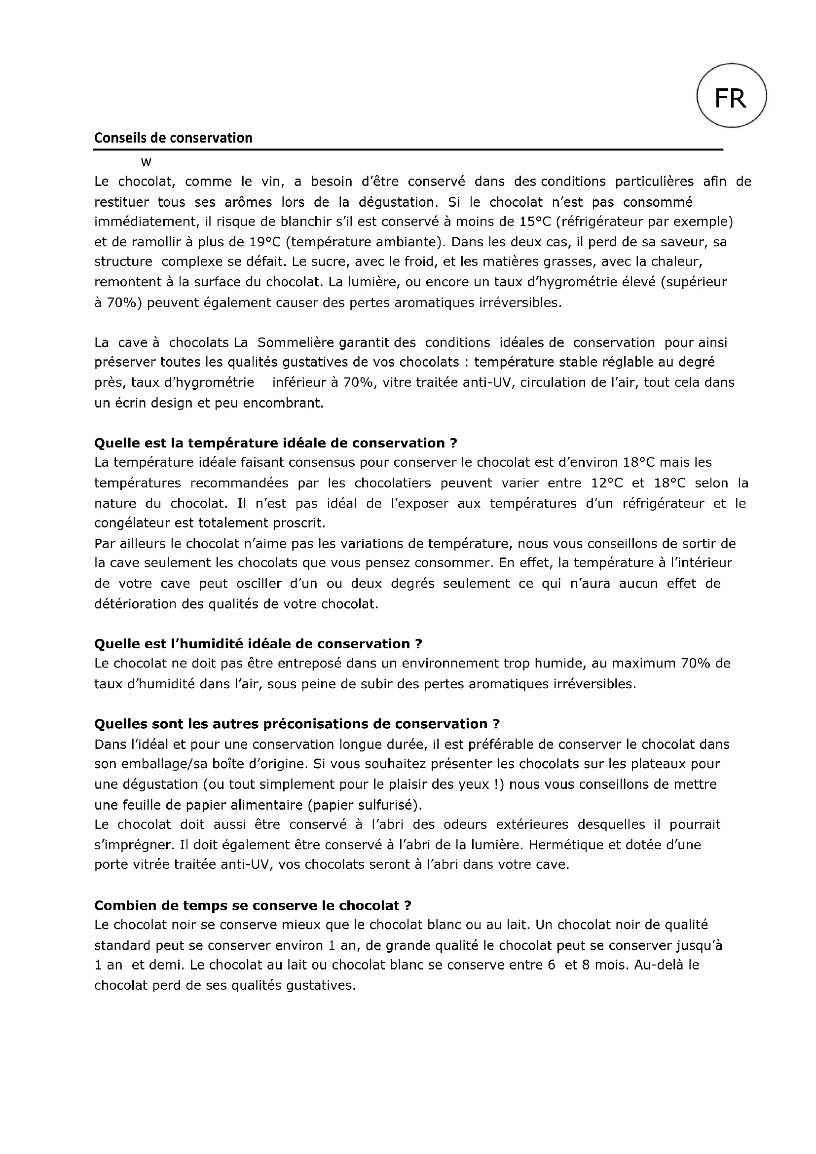 Veuillez lire attentivement les consignes de sécurité et d’installation Please read carefully and follow all safety rules and operating instructions. .Conseils de conservation Le chocolat, comme le vin, a besoin d’être conservé dans des conditions particulières afin de restituer tous ses arômes lors de la dégustation. Si le chocolat n’est pas consommé immédiatement, il risque de blanchir s’il est conservé à moins de 15°C (réfrigérateur par exemple) et de ramollir à plus de 19°C (température ambiante). Dans les deux cas, il perd de sa saveur, sa structure complexe se défait. Le sucre, avec le froid, et les matières grasses, avec la chaleur, remontent à la surface du chocolat. La lumière, ou encore un taux d’hygrométrie élevé (supérieur à 70%) peuvent également causer des pertes aromatiques irréversibles. La cave à chocolats La Sommelière garantit des conditions idéales de conservation pour ainsi préserver toutes les qualités gustatives de vos chocolats : température stable réglable au degré près, taux d’hygrométrie inférieur à 70%, vitre traitée anti-UV, circulation de l’air, tout cela dans un écrin design et peu encombrant. Quelle est la température idéale de conservation ? La température idéale faisant consensus pour conserver le chocolat est d’environ 18°C mais les températures recommandées par les chocolatiers peuvent varier entre 12°C et 18°C selon la nature du chocolat. Il n’est pas idéal de l’exposer aux températures d’un réfrigérateur et le congélateur est totalement proscrit. Par ailleurs le chocolat n’aime pas les variations de température, nous vous conseillons de sortir de la cave seulement les chocolats que vous pensez consommer. En effet, la température à l’intérieur de votre cave peut osciller d’un ou deux degrés seulement ce qui n’aura aucun effet de détérioration des qualités de votre chocolat. Quelle est l’humidité idéale de conservation ? Le chocolat ne doit pas être entreposé dans un environnement trop humide, au maximum 70% de taux d’humidité dans l’air, sous peine de subir des pertes aromatiques irréversibles. Quelles sont les autres préconisations de conservation ? Dans l’idéal et pour une conservation longue durée, il est préférable de conserver le chocolat dans son emballage/sa boîte d’origine. Si vous souhaitez présenter les chocolats sur les plateaux pour une dégustation (ou tout simplement pour le plaisir des yeux !) nous vous conseillons de mettre une feuille de papier alimentaire (papier sulfurisé). Le chocolat doit aussi être conservé à l’abri des odeurs extérieures desquelles il pourrait s’imprégner. Il doit également être conservé à l’abri de la lumière. Hermétique et dotée d’une porte vitrée traitée anti-UV, vos chocolats seront à l’abri dans votre cave. Combien de temps se conserve le chocolat ? Le chocolat noir se conserve mieux que le chocolat blanc ou au lait. Un chocolat noir de qualité standard peut se conserver environ 1 an, de grande qualité le chocolat peut se conserver jusqu’à 1 an et demi. Le chocolat au lait ou chocolat blanc se conserve entre 6 et 8 mois. Au-delà le chocolat perd de ses qualités gustatives. FRConseils de dégustation Nous vous conseillons de laisser le chocolat 5 minutes à température ambiante avant de le déguster. Afin de préserver les papilles gustatives, il est conseillé de commencer votre dégustation par les chocolats de la plus faible teneur en cacao à la plus forte (chocolat blanc au chocolat noir). Afin de ressentir au maximum les arômes, privilégiez un verre d’eau en accompagnement. Si les chocolats ne sont pas d’une qualité exceptionnelle, un thé ou un café pourront se révéler d’agréables compagnons, de même que des alcools vieux tels que l’Armagnac ou le cognac* qui feront naître d’étonnantes communions de saveurs. (* à boire avec modération). N’hésitez pas à demander à votre artisan chocolatier qui saura vous donner d’excellents conseils de dégustation selon le type de chocolat. Quant au moment idéal de dégustation, seule votre gourmandise et vos envies jugeront du moment opportun pour consommer vos précieux chocolats. Bonne dégustation !