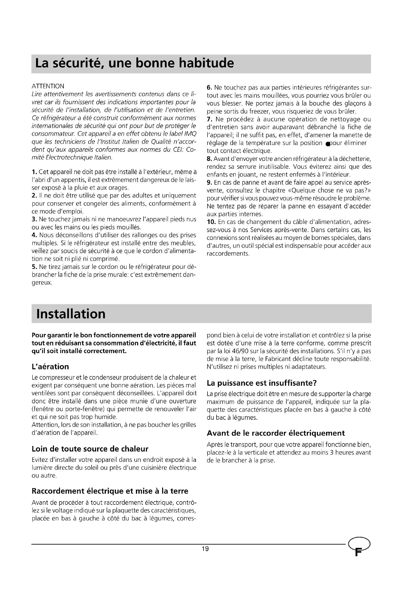 sez-vous à nos Services après-vente. Dans certains cas, les connexions sont réalisées au moyen de bornes spéciales, dans d’autres, un outil spécial est indispensable pour accéder aux raccordements. Installation Pour garantir le bon fonctionnement de votre appareil tout en réduisant sa consommation d’électricité, il faut qu’il soit installé correctement. L’aération Le compresseur et le condenseur produisent de la chaleur et exigent par conséquent une bonne aération. Les pièces mal ventilées sont par conséquent déconseillées. L’appareil doit donc être installé dans une pièce munie d’une ouverture (fenêtre ou porte-fenêtre) qui permette de renouveler l’air et qui ne soit pas trop humide. Attention, lors de son installation, à ne pas boucher les grilles d’aération de l’appareil. Loin de toute source de chaleur Evitez d’installer votre appareil dans un endroit exposé à la lumière directe du soleil ou près d’une cuisinière électrique ou autre. Raccordement électrique et mise à la terre Avant de procéder à tout raccordement électrique, contrô- lez si le voltage indiqué sur la plaquette des caractéristiques, placée en bas à gauche à côté du bac à légumes, corres- ATTENTION Lire attentivement les avertissements contenus dans ce li- vret car ils fournissent des indications importantes pour la sécurité de l’installation, de l’utilisation et de l’entretien. Ce réfrigérateur a été construit conformément aux normes internationales de sécurité qui ont pour but de protéger le consommateur. Cet appareil a en effet obtenu le label IMQ que les techniciens de l’Institut Italien de Qualité n’accor- dent qu’aux appareils conformes aux normes du CEI: Co- mité Electrotechnique Italien.