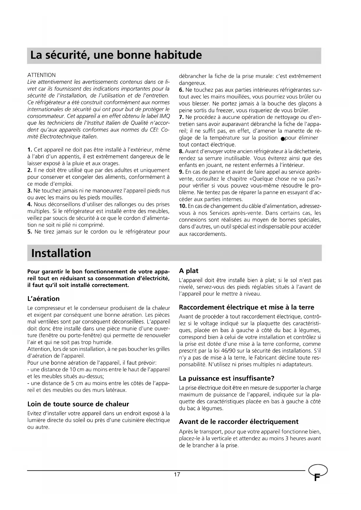 vous à nos Services après-vente. Dans certains cas, les connexions sont réalisées au moyen de bornes spéciales, dans d’autres, un outil spécial est indispensable pour accéder aux raccordements. Installation Pour garantir le bon fonctionnement de votre appa- reil tout en réduisant sa consommation d’électricité, il faut qu’il soit installé correctement. L’aération Le compresseur et le condenseur produisent de la chaleur et exigent par conséquent une bonne aération. Les pièces mal ventilées sont par conséquent déconseillées. L’appareil doit donc être installé dans une pièce munie d’une ouver- ture (fenêtre ou porte-fenêtre) qui permette de renouveler l’air et qui ne soit pas trop humide. Attention, lors de son installation, à ne pas boucher les grilles d’aération de l’appareil. Pour une bonne aération de l’appareil, il faut prévoir: - une distance de 10 cm au moins entre le haut de l’appareil et les meubles situés au-dessus; - une distance de 5 cm au moins entre les côtés de l’appa- reil et des meubles ou des murs latéraux. Loin de toute source de chaleur Evitez d’installer votre appareil dans un endroit exposé à la lumière directe du soleil ou près d’une cuisinière électrique ou autre. ATTENTION Lire attentivement les avertissements contenus dans ce li- vret car ils fournissent des indications importantes pour la sécurité de l’installation, de l’utilisation et de l’entretien. Ce réfrigérateur a été construit conformément aux normes internationales de sécurité qui ont pour but de protéger le consommateur. Cet appareil a en effet obtenu le label IMQ que les techniciens de l’Institut Italien de Qualité n’accor- dent qu’aux appareils conformes aux normes du CEI: Co- mité Electrotechnique Italien.