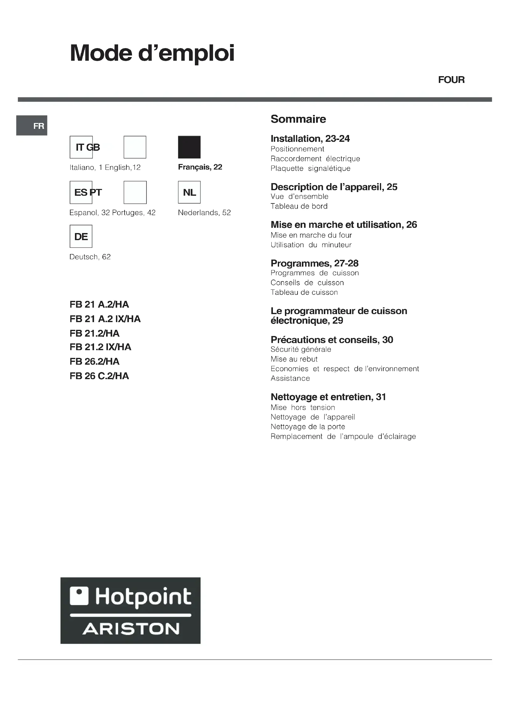 FB 21.2 - Four Ariston Thermo - Notice d'utilisation et mode d'emploi gratuit