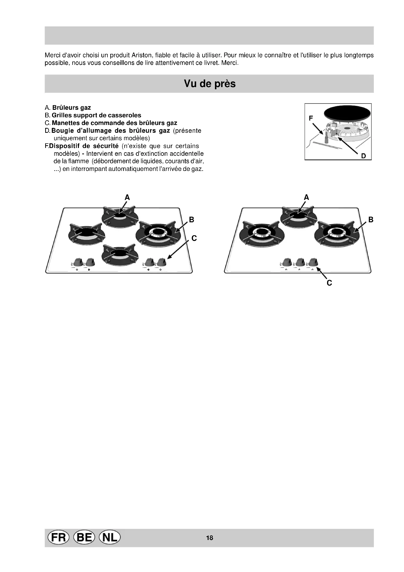 Cet appareil est conforme aux Directives Communautaires suivantes: - 73/23/CEE du 19/02/73 (Basse Tension) et modifications successives; - 89/336/CEE du 03/05/89 (Compatibilité électromagnétique) et modifications successives; - 90/396/CEE du 29/06/90 (Gaz) et modifications successives (uniquement pour modèles à gaz); - 93/68/CEE du 22/07/93 et modifications successives. - 2002/96/EC La Directive Européenne 2002/96/EC sur les Déchets des Equipements Electriques et Electroniques (DEEE), exige que les appareils ménagers usagés ne soient pas jetés dans le flux normal des déchets municipaux. Les appareils usagés doivent être collectés séparément afin d’optimiser le taux de récupération et le recyclage des matériaux qui les composent et réduire l’impact sur la santé humaine et l’environnement. Le symbole de la ‘‘poubelle barrée’’ est apposée sur tous les produits pour rappeler les obligations de collecte séparée. Les consommateurs devront contacter les autorités locales ou leur revendeur concernant la démarche à suivre pour l’enlèvement de leur vieil appareil.27 Wij danken u dat u een Ariston product heeft gekozen, veilig en gemakkelijk in het gebruik. Om het fornuis te leren kennen moet het langdurig en zo goed mogelijk gebruikt worden. Wij raden u aan deze gebruiksaanwijzing te lezen. Dank u. A. Gasbranders B. Roosters voor de pannen C. Bedieningsknoppen van de gasbranders D. Ontsteking gasbranders (slechts op enkele modellen aanwezig) F. Veiligheidsmechanisme (slechts op enkele modellen aanwezig) - Dit treedt in werking als de vlam per ongeluk is uitgegaan (overkoken, tocht enz.) door de gastoevoer van de brander te blokkeren Van dichtbij gezien