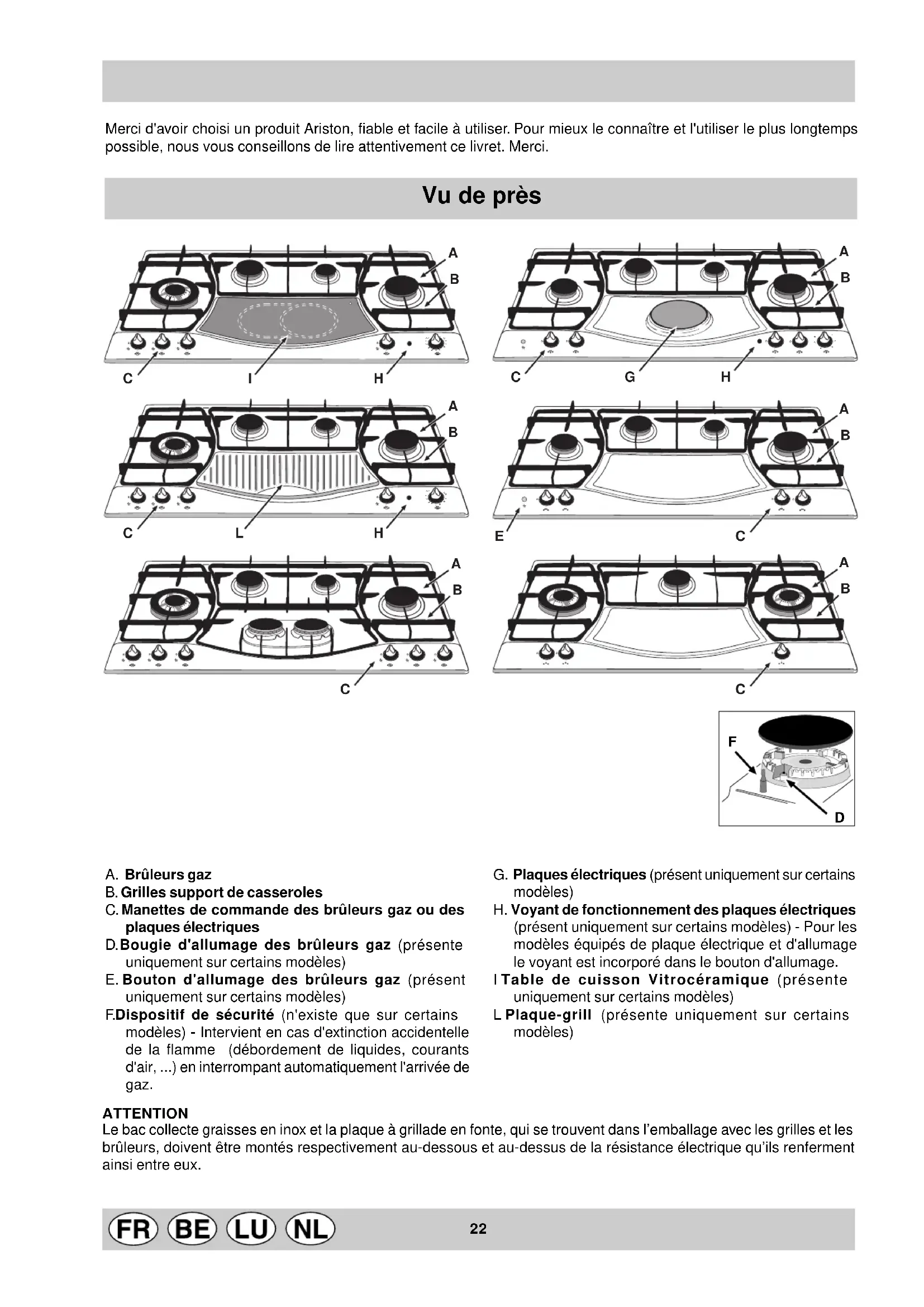 The European Directive 2002/96/EC on Waste Electrical and Electronic Equipment (WEEE), requires that old household electrical appliances must not be disposed of in the normal unsorted municipal waste stream. Old appliances must be collected separately in order to optimise the recovery and recycling of the materials they contain and reduce the impact on human health and the environment. The crossed out “wheeled bin” symbol on the product reminds you of your obligation, that when you dispose of the appliance it must be separately collected. Consumers should contact their local authority or retailer for information concerning the correct disposal of their old appliance. This appliance complies with the following European Economic Community directives: - 73/23/EEC of 19/02/73 (Low Voltage) and subsequent modifications; - 89/336/EEC of 03/05/89 (Electromagnetic Compatibility) and subsequent modifications; - 90/396/EEC of 29/06/90 (Gas) and subsequent modifications; - 93/68/EEC of 22/07/93 and subsequent modifications. - 2002/96/EEC22 Merci d'avoir choisi un produit Ariston, fiable et facile à utiliser. Pour mieux le connaître et l'utiliser le plus longtemps possible, nous vous conseillons de lire attentivement ce livret. Merci. Vu de près G. Plaques électriques (présent uniquement sur certains modèles) H. Voyant de fonctionnement des plaques électriques (présent uniquement sur certains modèles) - Pour les modèles équipés de plaque électrique et d'allumage le voyant est incorporé dans le bouton d'allumage. I Table de cuisson Vitrocéramique (présente uniquement sur certains modèles) L Plaque-grill (présente uniquement sur certains modèles) A. Brûleurs gaz B. Grilles support de casseroles C. Manettes de commande des brûleurs gaz ou des plaques électriques D. Bougie d'allumage des brûleurs gaz (présente uniquement sur certains modèles) E. Bouton d'allumage des brûleurs gaz (présent uniquement sur certains modèles) F. Dispositif de sécurité (n'existe que sur certains modèles) - Intervient en cas d'extinction accidentelle de la flamme (débordement de liquides, courants d'air, ...) en interrompant automatiquement l'arrivée de gaz. ATTENTION Le bac collecte graisses en inox et la plaque à grillade en fonte, qui se trouvent dans l’emballage avec les grilles et les brûleurs, doivent être montés respectivement au-dessous et au-dessus de la résistance électrique qu’ils renferment ainsi entre eux.