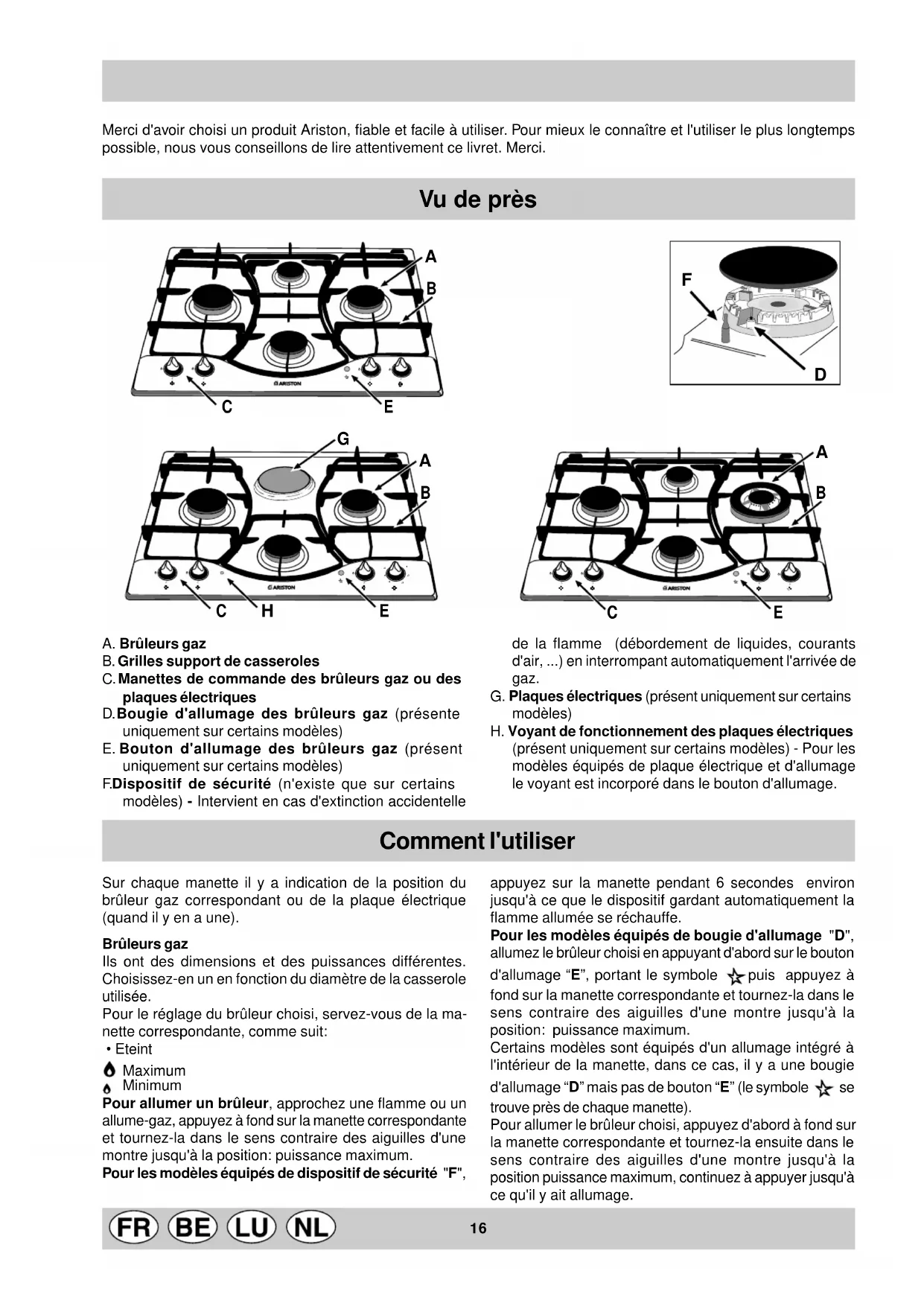 A. Brûleurs gaz B. Grilles support de casseroles C. Manettes de commande des brûleurs gaz ou des plaques électriques D. Bougie d'allumage des brûleurs gaz (présente uniquement sur certains modèles) E. Bouton d'allumage des brûleurs gaz (présent uniquement sur certains modèles) F. Dispositif de sécurité (n'existe que sur certains modèles) - Intervient en cas d'extinction accidentelle de la flamme (débordement de liquides, courants d'air, ...) en interrompant automatiquement l'arrivée de gaz. G. Plaques électriques (présent uniquement sur certains modèles) H. Voyant de fonctionnement des plaques électriques (présent uniquement sur certains modèles) - Pour les modèles équipés de plaque électrique et d'allumage le voyant est incorporé dans le bouton d'allumage. Vu de près Sur chaque manette il y a indication de la position du brûleur gaz correspondant ou de la plaque électrique (quand il y en a une). Brûleurs gaz Ils ont des dimensions et des puissances différentes. Choisissez-en un en fonction du diamètre de la casserole utilisée. Pour le réglage du brûleur choisi, servez-vous de la ma- nette correspondante, comme suit: