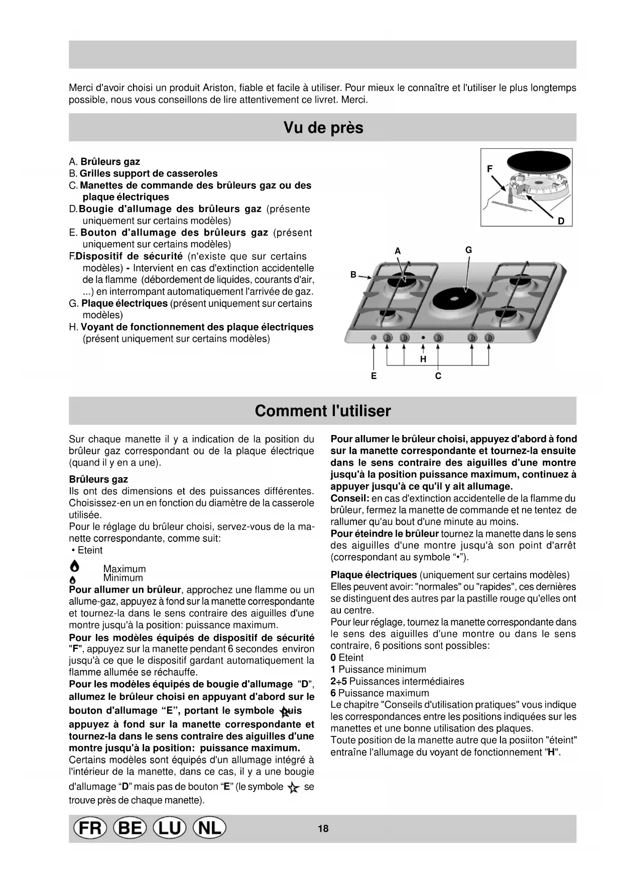 Characteristic of the burners and nozzles18 Merci d'avoir choisi un produit Ariston, fiable et facile à utiliser. Pour mieux le connaître et l'utiliser le plus longtemps possible, nous vous conseillons de lire attentivement ce livret. Merci. A. Brûleurs gaz B. Grilles support de casseroles C. Manettes de commande des brûleurs gaz ou des plaque électriques D. Bougie d'allumage des brûleurs gaz (présente uniquement sur certains modèles) E. Bouton d'allumage des brûleurs gaz (présent uniquement sur certains modèles) F. Dispositif de sécurité (n'existe que sur certains modèles) - Intervient en cas d'extinction accidentelle de la flamme (débordement de liquides, courants d'air, ...) en interrompant automatiquement l'arrivée de gaz. G. Plaque électriques (présent uniquement sur certains modèles) H. Voyant de fonctionnement des plaque électriques (présent uniquement sur certains modèles) Vu de près Sur chaque manette il y a indication de la position du brûleur gaz correspondant ou de la plaque électrique (quand il y en a une). Brûleurs gaz Ils ont des dimensions et des puissances différentes. Choisissez-en un en fonction du diamètre de la casserole utilisée. Pour le réglage du brûleur choisi, servez-vous de la ma- nette correspondante, comme suit: