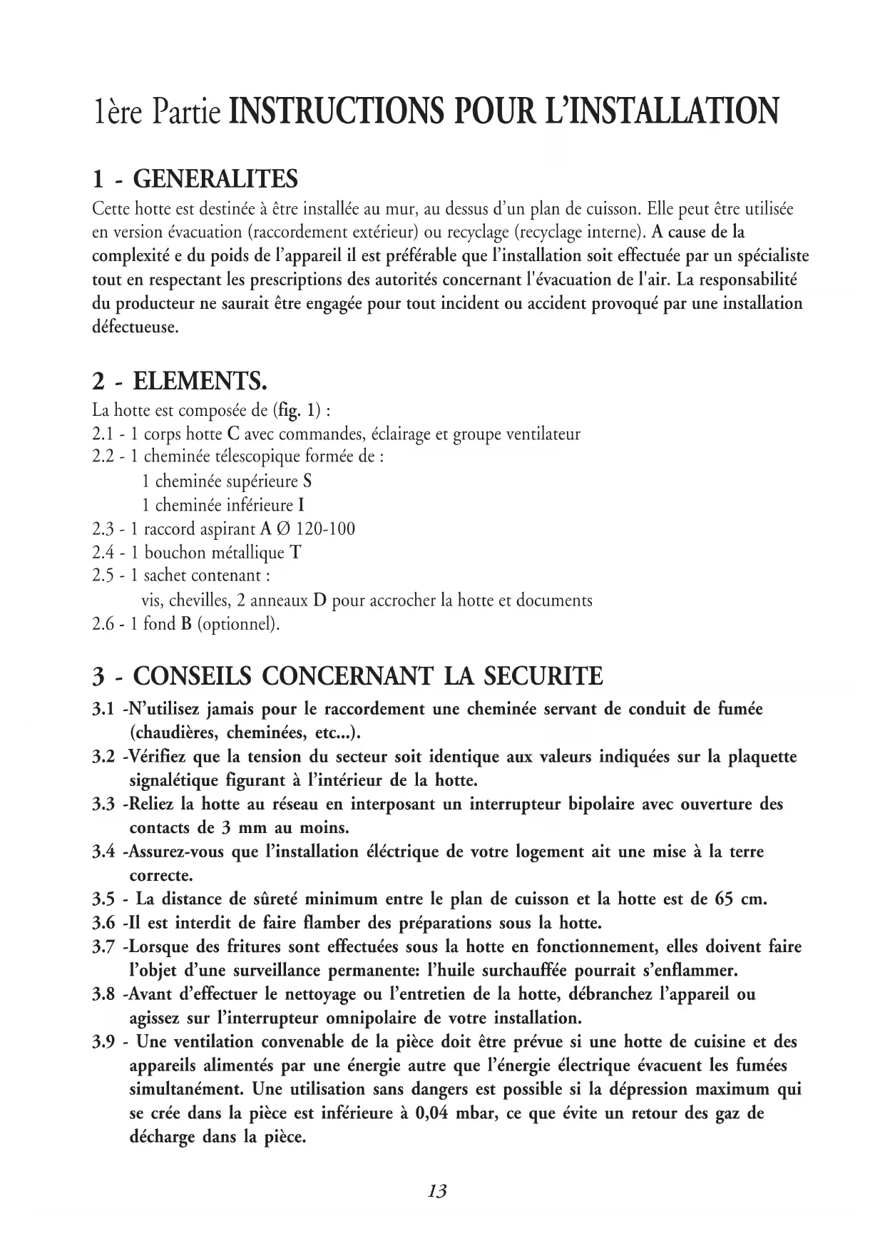 Cette hotte est destinée à être installée au mur, au dessus d’un plan de cuisson. Elle peut être utilisée en version évacuation (raccordement extérieur) ou recyclage (recyclage interne). A cause de la complexité e du poids de l’appareil il est préférable que l’installation soit effectuée par un spécialiste tout en respectant les prescriptions des autorités concernant l'évacuation de l'air. La responsabilité du producteur ne saurait être engagée pour tout incident ou accident provoqué par une installation défectueuse.