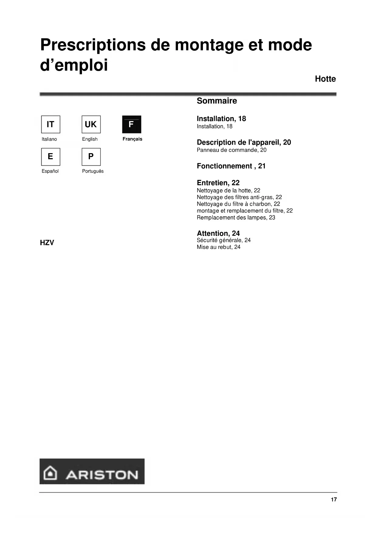 HZV Sommaire Installation, 18 Installation, 18 Description de l'appareil, 20 Panneau de commande, 20 Fonctionnement , 21 Entretien, 22 Nettoyage de la hotte, 22 Nettoyage des filtres anti-gras, 22 Nettoyage du filtre à charbon, 22 montage et remplacement du filtre, 22 Remplacement des lampes, 23 Attention, 24 Sécurité générale, 24 Mise au rebut, 2418