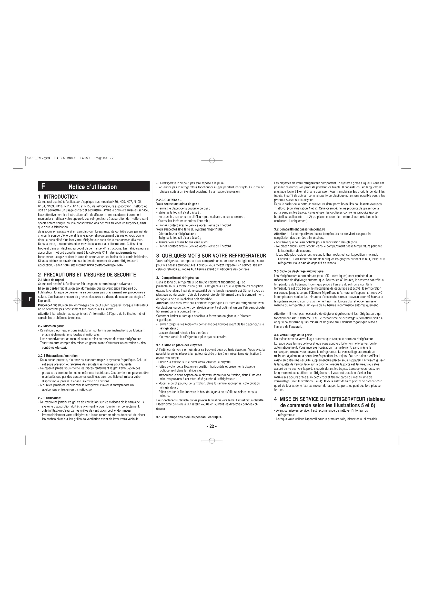N97 - Réfrigérateur THETFORD - Notice d'utilisation et mode d'emploi gratuit