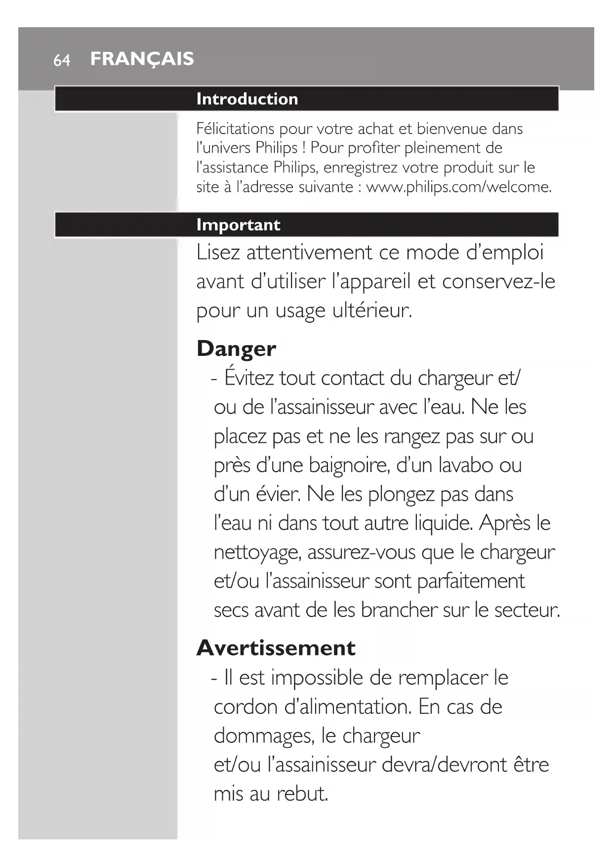 N’utilisez pas le chargeur et/ou l’assainisseur en extérieur ou à proximité d’une surface chauffée. Ne faites jamais fonctionner l’assainisseur dans des endroits où des produits aérosols (en spray) sont utilisés ou dans des lieux où de l’oxygène est administré. - Si l’appareil (brossette, manche de la brosse, chargeur et/ou assainisseur) est endommagé, cessez de l’utiliser. L’appareil ne contient aucune pièce réparable. S’il est endommagé, contactez le Service Consommateurs de votre pays (voir le chapitre « Garantie et service »). FrançaiS 65- Cet appareil peut être utilisé par des enfants âgés de 8 ans ou plus, des personnes dont les capacités physiques, sensorielles ou intellectuelles sont réduites ou des personnes manquant d’expérience et de connaissances, à condition que ces enfants ou personnes soient sous surveillance ou qu’ils aient reçu des instructions quant à l’utilisation sécurisée de l’appareil et qu’ils aient pris connaissance des dangers encourus. Le nettoyage et l’entretien ne doivent pas être réalisés par des enfants sauf s’ils sont âgés de plus de 8 ans et sous surveillance. Tenez l’appareil et son cordon hors de portée des enfants de moins de 8 ans. - Les enfants ne doivent pas jouer avec l’appareil. - Cessez d’utiliser l’assainisseur si la lampe UV reste allumée alors que l’appareil est ouvert. Les UV peuvent être dangereux pour les yeux et la peau. Tenez toujours l’assainisseur hors de portée des enfants. FrançaiS66Attention - Ne mettez pas la brossette, le manche, le chargeur de voyage, le couvercle du chargeur ou l’assainisseur au lave-vaisselle. - Si vous avez reçu des soins bucco- dentaires, notamment au niveau des gencives, au cours des deux derniers mois, consultez votre dentiste avant d’utiliser cette brosse à dents. - Consultez votre dentiste si vos gencives saignent de manière excessive après utilisation de cette brosse à dents ou si le saignement persiste après une semaine d’utilisation. Consultez également votre dentiste si l’utilisation de Sonicare entraîne des douleurs ou un inconfort. - La brosse à dents Sonicare est conforme aux normes de sécurité relatives aux appareils électromagnétiques. Si vous avez des questions concernant l’utilisation de la brosse à dents Sonicare avec un stimulateur cardiaque ou tout autre dispositif implanté, contactez votre médecin traitant ou le fabricant de ce dispositif avant utilisation. FRANÇAIS 67- Si vous avez des problèmes de santé, consultez votre médecin avant d’utiliser la brosse à dents Sonicare. - Cet appareil a été conçu exclusivement pour le brossage des dents, des gencives et de la langue. Ne l’utilisez jamais à d’autres ns. Si son utilisation devait s’avérer inconfortable ou douloureuse, cessez d’utiliser l’appareil et consultez votre médecin. - La brosse à dents Sonicare est un appareil de soins personnel et n’est pas destinée à être utilisée sur plusieurs patients dans les cabinets ou établissements dentaires. - Cessez d’utiliser une brossette dont les poils sont écrasés ou tordus. Remplacez la brossette tous les 3 mois ou plus tôt si vous constatez des signes d’usure. - N’utilisez pas d’autres têtes de brosse que celles recommandées par le fabricant. FrançaiS68- Si votre dentifrice contient du peroxyde, du bicarbonate de soude ou du bicarbonate (couramment utilisés dans les dentifrices blanchissants), nettoyez bien la brossette avec de l’eau et du savon après chaque utilisation an de prévenir toute ssure éventuelle du plastique. - N’insérez pas d’objets dans les orices d’entrée et de sortie d’air de l’assainisseur ou ne bloquez pas ceux-ci en plaçant l’appareil sur une surface molle ou dans une position ou un endroit où des objets pourraient bloquer ces orices (exemples d’objets : magazines, papier de soie et cheveux). - Ne touchez pas la lampe UV pendant et juste après le cycle d’assainissement, lorsqu’elle est chaude. - N’utilisez pas l’assainisseur sans l’écran de protection pour éviter tout contact avec la lampe, car elle peut être chaude. FrançaiS 69- Si l’assainisseur a été utilisé pour 3 cycles de nettoyage UV consécutifs (c’est-à-dire 3 fois à la suite), éteignez-le au moins pendant 30 minutes avant de lancer un nouveau cycle de nettoyage UV. Champs électromagnétiques (CEM) Cet appareil Philips est conforme à toutes les normes relatives aux champs électromagnétiques (CEM). Il répond aux règles de sécurité établies sur la base des connaissances scientiques actuelles s’il est manipulé correctement et conformément aux instructions de ce mode d’emploi. Description générale (g. 1) 1 Capuchon de protection hygiénique 2 Brossette avec identiant unique 3 Manche 4 Bouton marche/arrêt 5 Indicateur de niveau d’intensité 6 Bouton de niveau d’intensité (+ et -) 7 Modes de brossage 8 Bouton de mode 9 Témoin de niveau de charge 10 Assainisseur UV et base avec chargeur intégré et range-cordon (sur certains modèles uniquement) - Non illustré : lampe UV - Non illustré : plateau égouttoir de l’assainisseur - Non illustré : écran de protection pour lampe UV FrançaiS7011 Cordon d’alimentation avec che secteur 12 Chargeur Deluxe (sur certains modèles uniquement) 13 Couvercle de chargeur avec supports pour brossettes et base avec range-cordon 14 Chargeur de voyage - Non illustré : étui de transport Remarque : Le contenu de la boîte peut varier selon le modèle acheté. Avant utilisation Fixation de la brossette 1 Alignez la partie inférieure de la brossette avec la partie supérieure du manche. 2 Insérez le manche métallique au maximum dans la brossette. Remarque : Des images facilement identiables sont présentes sur les brossettes Sonicare Platinum an que vous reconnaissiez rapidement votre brossette. Charge de l’appareil 1 Branchez l’assainisseur ou le chargeur sur la 