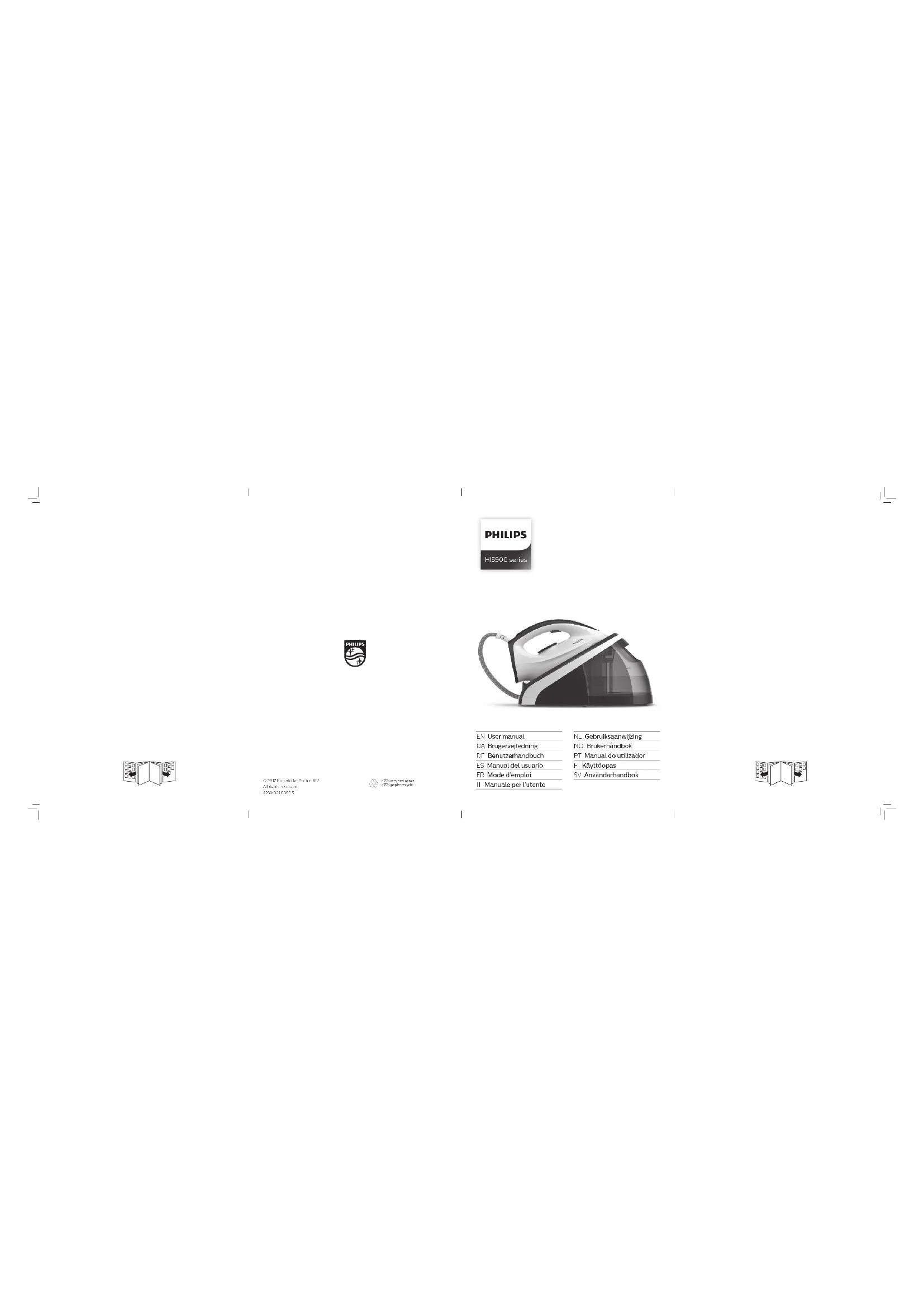 anticalcaire. Attention : N'interrompez pas le processus en relevant le fer du réservoir anticalcaire car de l'eau chaude et de la vapeur sortent de la semelle.24 Français 1 Remplissez le réservoir d'eau à moitié (Fig. 4). Remarque : Assurez-vous que l'appareil est branché et allumé pendant le traitement anticalcaire. 2 Placez le réservoir anticalcaire intelligent sur la planche à repasser ou sur une autre surface plane et stable. 3 Placez le fer de manière stable sur le réservoir anticalcaire (Fig. 5). Remarque : Le réservoir anticalcaire a été conçu pour recueillir les particules de calcaire et l'eau chaude pendant le traitement anticalcaire. Il est parfaitement sûr de poser le fer sur ce réservoir pendant tout le traitement. 4 Maintenez enfoncé le bouton Calc-Clean pendant 2 secondes jusqu'à ce que de brefs signaux sonores retentissent (Fig. 6). 5 Pendant le traitement anticalcaire, de brefs signaux sonores retentissent, ainsi qu'un bruit de pompe (Fig. 7). 6 Lorsque la fonction anticalcaire est terminée, le fer cesse d'émettre des signaux sonores et le voyant CALC-CLEAN cesse de clignoter (Fig. 8). 7 Essuyez le fer avec un chion et replacez-le sur la base (Fig. 9). 8 Le réservoir anticalcaire devenant chaud pendant le traitement anticalcaire, patientez environ 5 minutes avant de le toucher. Transportez ensuite le réservoir anticalcaire vers l'évier, videz-le et rangez-le pour un usage ultérieur (Fig. 10). 9 Si nécessaire, vous pouvez répéter les étapes 1 à 7. Veillez à vider le réservoir anticalcaire avant de commencer le traitement anticalcaire. Remarque : Pendant le traitement anticalcaire, de l'eau propre peut s'écouler de la semelle si aucun résidu de calcaire ne s'est accumulé dans le fer. Ce phénomène est normal. Dépannage Cette rubrique récapitule les problèmes les plus courants que vous pouvez rencontrer avec l'appareil. Si vous ne parvenez pas à résoudre un problème à l'aide des renseignements ci-dessous, rendez- vous sur le site www.philips.com/support et consultez la liste des questions fréquemment posées ou contactez le Service Consommateurs Philips de votre pays. Problème Cause possible Solution L'appareil ne produit pas de vapeur. Vous avez réglé le thermostat sur SYNTH à 1. Réglez le thermostat sur la position 2 ou supérieure. La fonction vapeur reste désactivée jusqu'à ce que vous ayez eectué la procédure de détartrage. Eectuez la procédure de détartrage pour réactiver la fonction vapeur. (reportez-vous au chapitre « Nettoyage et entretien ») Au début de votre séance de repassage, la gâchette vapeur n'a pas été maintenue enfoncée assez longtemps. Maintenez la gâchette vapeur enfoncée jusqu'à ce que la vapeur s'échappe de l'appareil. Jusqu'à 30 secondes peuvent s'écouler avant que la vapeur ne sorte. Le voyant Calc-Clean clignote. Aucune vapeur ne s'échappe de la semelle et/ou l'appareil émet un signal sonore. Vous n'avez pas exécuté ou terminé le traitement anticalcaire. Exécutez le traitement anticalcaire pour réactiver la fonction vapeur (voir le chapitre « Nettoyage et entretien »).25 Français Problème Cause possible Solution L'appareil s'est éteint. La fonction d‘arrêt automatique est automatiquement activée lorsque l‘appareil n‘a pas été utilisé pendant plus de 5 minutes. Pour réactiver l'appareil, réglez le bouton marche/arrêt sur la position « Arrêt », puis sur la position « Marche ». L'appareil recommence alors à chauer. Le fer produit un bruit de pompe. Le réservoir d'eau est vide. Remplissez le réservoir d'eau avec de l'eau et appuyez sur la gâchette vapeur jusqu'à ce que le bruit de pompe s'atténue et que de la vapeur s'échappe de la semelle. Des gouttes d'eau s'écoulent de la semelle. Après le traitement anticalcaire, de l'eau peut s'écouler de la semelle. Essuyez soigneusement la semelle à l'aide d'un chion sec. Si le voyant Calc-Clean continue de clignoter et l'appareil continue d'émettre un signal sonore, exécutez le traitement anticalcaire (voir le chapitre « Nettoyage et entretien »). De l'eau sale et des impuretés (taches marron, particules de calcaire, etc.) s'échappent de la semelle. Des impuretés ou dépôts de calcaire se sont formés sur les évents à vapeur et/ou la semelle. Exécutez régulièrement le traitement anticalcaire (voir le chapitre « Nettoyage et entretien »). De l'eau s'écoule de la semelle. Vous avez accidentellement démarré le traitement anticalcaire (voir le chapitre « Nettoyage et entretien »). Éteignez l'appareil, puis rallumez-le. Laissez chauer le fer jusqu'à ce que le voyant « Fer prêt » du fer reste allumé.26 Italiano Introduzione Congratulazioni per l'acquisto e benvenuti in Philips! Per trarre il massimo vantaggio dall'assistenza fornita da Philips, registrate il vostro prodotto sul sito www.philips.com/welcome. Prima di utilizzare l'apparecchio, leggete attentamente il manuale dell'utente, l'opuscolo "Informazioni importanti" e la guida rapida. Conservateli per eventuali riferimenti futuri. Panoramica del prodotto (Fig. 1) 1 Tubo dell'acqua 2 Termostato 3 Pulsante del vapore/colpo di vapore 4 Spia di "ferro da stiro pronto" 5 Pulsante CALC-CLEAN con spia 6 Base d'appoggio 7 Pulsante di sgancio del serbatoio dell'acqua 8 Serbatoio dell'acqua estraibile 9 Interruttore on/o 10 Cavo di alimentazione con spina 11 Contenitore Smart Calc-Clean Importante Eseguite la procedura di rimozione del calcare regolarmente per maggiore vapore e durata del ferro. Acqua consigliata Acqua distillata o demineralizzata se vivete in un'area con acqua dura. Tipo di acqua da utilizzare Questo apparecchio è stato progettato per essere utilizzato con acqua corrente. Se vivete in un'area con acqua dura, potrebbe vericarsi un repentino accumulo di calcare. Si consiglia, quindi, di usare acqua distillata o demineralizza per prolungare la vita dell'apparecchio. Avvertenza: non utilizzate acqua profumata, acqua pr