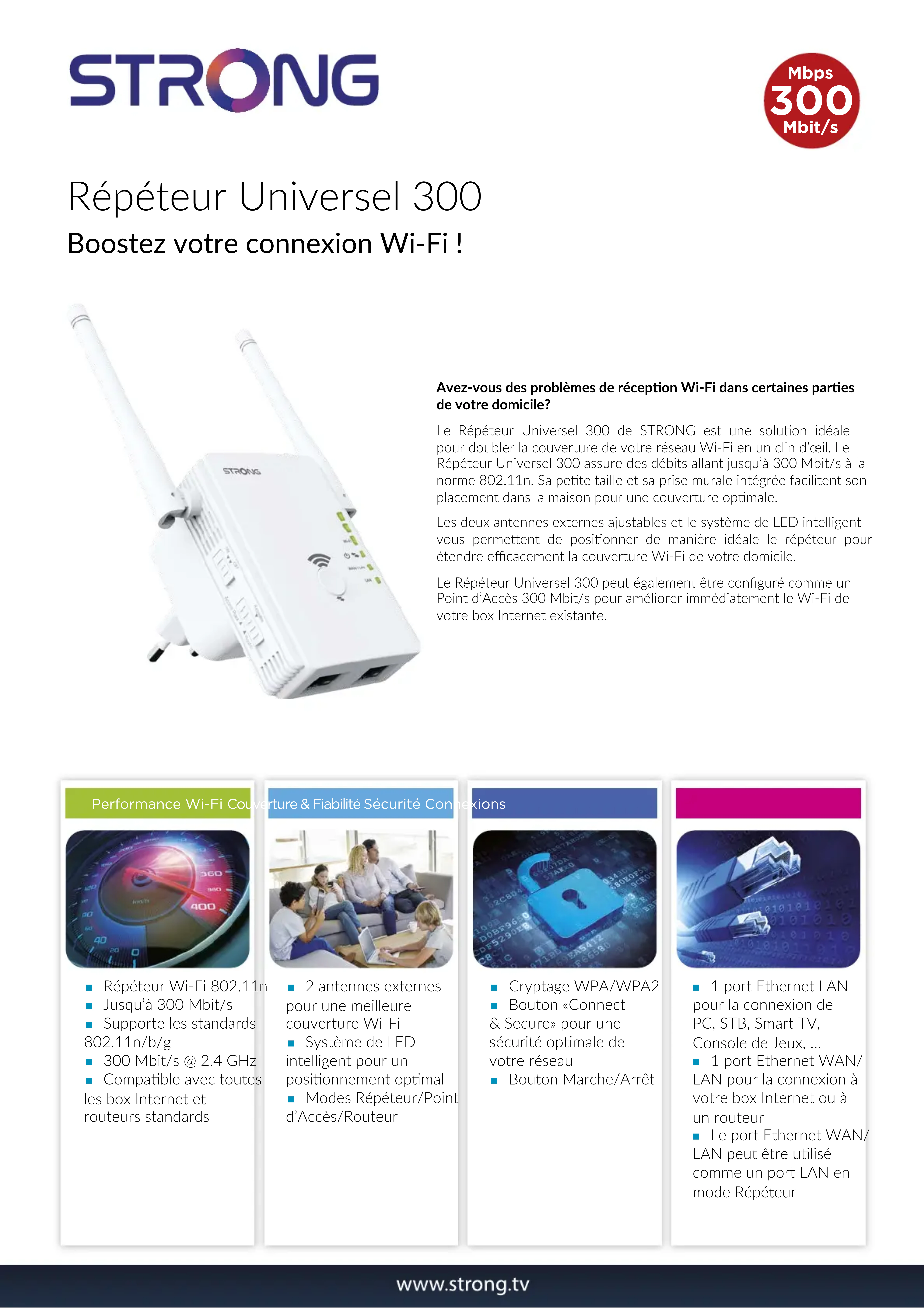 Répéteur Universel 300 Boostez votre connexion Wi-Fi ! Avez-vous des problèmes de récepon Wi-Fi dans certaines pares de votre domicile?Le Répéteur Universel 300 de STRONG est une soluon idéale pour doubler la couverture de votre réseau Wi-Fi en un clin d’œil. Le Répéteur Universel 300 assure des débits allant jusqu’à 300 Mbit/s à la norme 802.11n. Sa pete taille et sa prise murale intégrée facilitent son placement dans la maison pour une couverture opmale.Les deux antennes externes ajustables et le système de LED intelligent vous permeent de posionner de manière idéale le répéteur pour étendre ecacement la couverture Wi-Fi de votre domicile.Le Répéteur Universel 300 peut également être conguré comme un Point d’Accès 300 Mbit/s pour améliorer immédiatement le Wi-Fi de votre box Internet existante. Répéteur Wi-Fi 802.11n Jusqu’à 300 Mbit/s Supporte les standards 802.11n/b/g 300 Mbit/s @ 2.4 GHz Compable avec toutes les box Internet et routeurs standards 2 antennes externes pour une meilleure couverture Wi-Fi Système de LED intelligent pour un posionnement opmal Modes Répéteur/Point d’Accès/Routeur Cryptage WPA/WPA2 Bouton «Connect & Secure» pour une sécurité opmale de votre réseau Bouton Marche/Arrêt 1 port Ethernet LAN pour la connexion de PC, STB, Smart TV, Console de Jeux, … 1 port Ethernet WAN/ LAN pour la connexion à votre box Internet ou à un routeur Le port Ethernet WAN/ LAN peut être ulisé comme un port LAN en mode Répéteur Performance Wi-Fi Couverture & Fiabilité Sécurité ConnexionsMbps Mbit/s