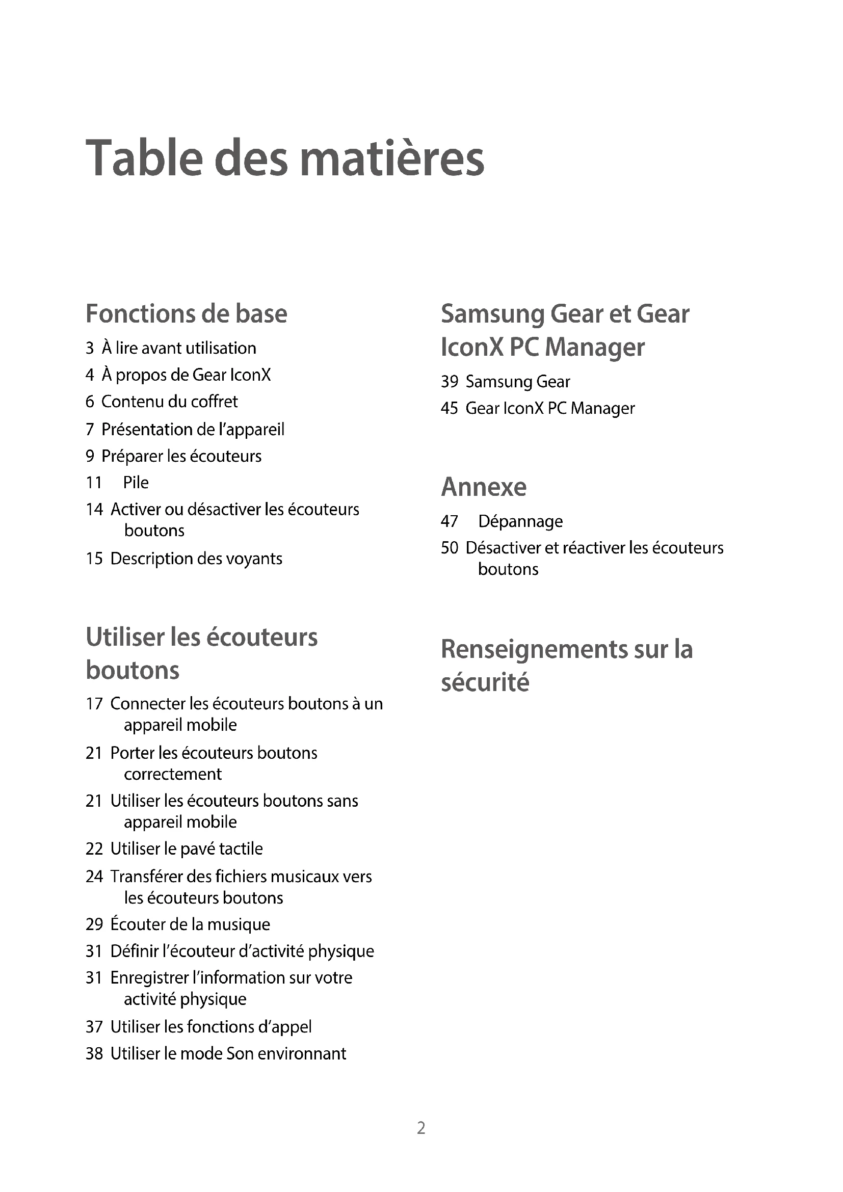 www.samsung.com Mode d’emploi SM-R140 Français (CA) 10/2017. Rev.1.02 Table des matières Fonctions de base 3 À lire avant utilisation 4 À propos de Gear IconX 6 Contenu du coffret 7 Présentation de l’appareil 9 Préparer les écouteurs 11 Pile 14 Activer ou désactiver les écouteurs boutons 15 Description des voyants Utiliser les écouteurs boutons 17 Connecter les écouteurs boutons à un appareil mobile 21 Porter les écouteurs boutons correctement 21 Utiliser les écouteurs boutons sans appareil mobile 22 Utiliser le pavé tactile 24 Transférer des fichiers musicaux vers les écouteurs boutons 29 Écouter de la musique 31 Définir l’écouteur d’activité physique 31 Enregistrer l’information sur votre activité physique 37 Utiliser les fonctions d’appel 38 Utiliser le mode Son environnant Samsung Gear et Gear IconX PC Manager 39 Samsung Gear 45 Gear IconX PC Manager Annexe 47 Dépannage 50 Désactiver et réactiver les écouteurs boutons Renseignements sur la sécurité3 Fonctions de base À lire avant utilisation Veuillez lire attentivement ce mode d’emploi, afin de pouvoir utiliser l’appareil correctement et en toute sécurité.