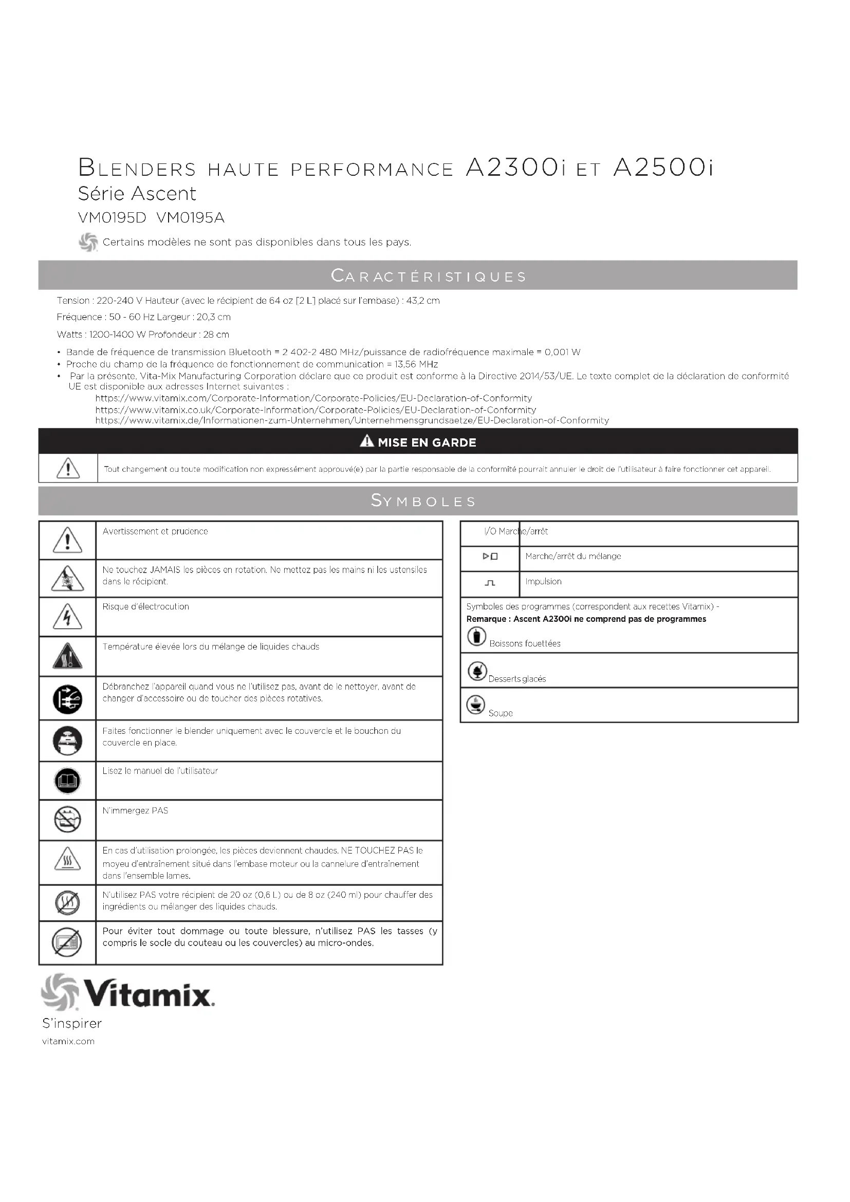 Total Nutrition Center Ltd. Room 901-902 9/F Kingdom Power Commercial Building 32-36 Des Voeux Road West Hong Kong Tel.: (+852) 2881.8270Blenders HAute PerformAnce A2300i et A2500i Série Ascent VM0185Avertissement et prudenceNe touchez JAMAIS les pièces en rotation. Ne mettez pas les mains ni les ustensiles dans le récipient.Risque d’électrocutionTempérature élevée lors du mélange de liquides chaudsDébranchez l’appareil quand vous ne l’utilisez pas, avant de le nettoyer, avant de changer d’accessoire ou de toucher des pièces rotatives.Faites fonctionner le blender uniquement avec le couvercle et le bouchon du couvercle en place.Lisez le manuel de l’utilisateurN’immergez PASEn cas d’utilisation prolongée, les pièces deviennent chaudes. NE TOUCHEZ PAS le moyeu d’entraînement situé dans l’embase moteur ou la cannelure d’entraînement dans l’ensemble lames.N’utilisez PAS votre récipient de 20oz (0,6L) ou de 8oz (240ml) pour chauffer des ingrédients ou mélanger des liquides chauds. Pour éviter tout dommage ou toute blessure, n’utilisez PAS les tasses (y compris le socle du couteau ou les couvercles) au micro-ondes. Sy m b o l e S ca r ac t é r i St i q u e S Tension: 220-240 V Hauteur (avec le récipient de 64oz [2L] placé sur l’embase): 43,2 cm Fréquence: 50 - 60 Hz Largeur: 20,3 cmWatts: 1200-1400 W Profondeur: 28 cm• Bande de fréquence de transmission Bluetooth = 2402-2480 MHz/puissance de radiofréquence maximale= 0,001W• Proche du champ de la fréquence de fonctionnement de communication= 13,56MHz