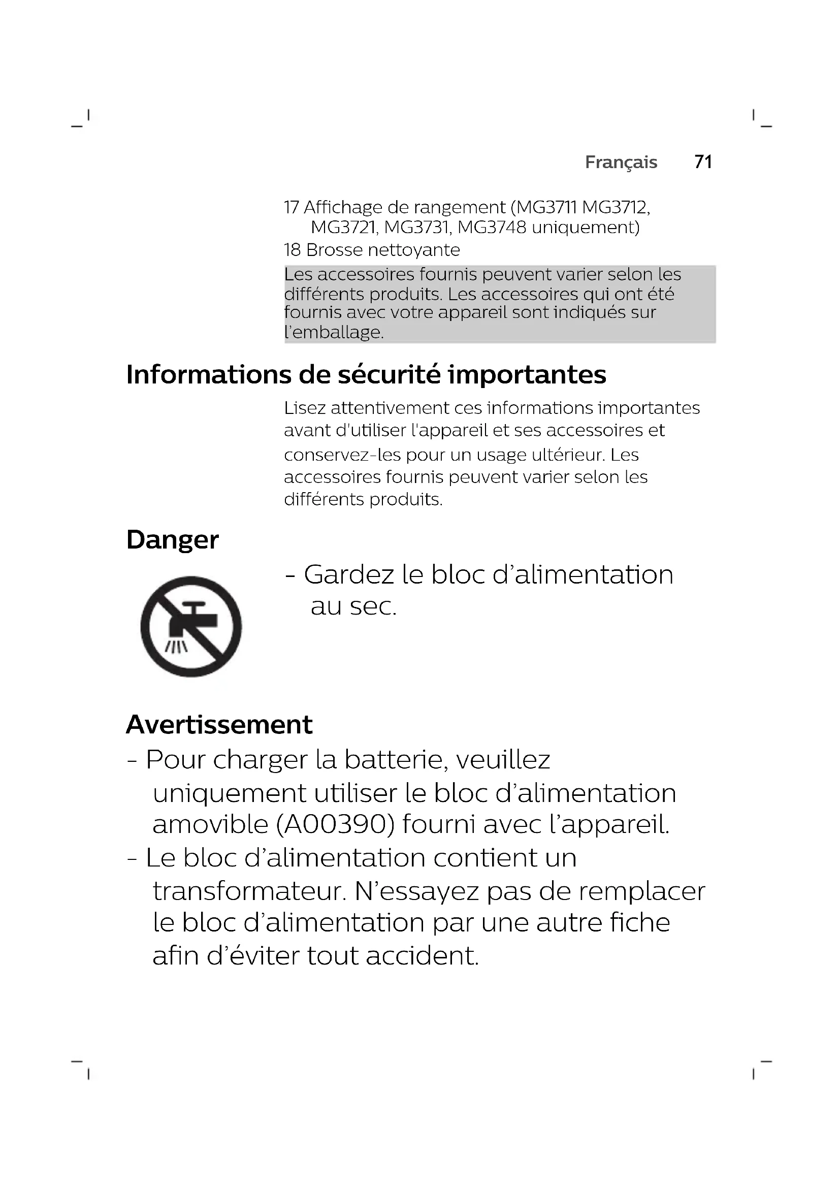 Français17 Affichage de rangement (MG3711 MG3712, MG3721, MG3731, MG3748 uniquement) 18 Brosse nettoyante Les accessoires fournis peuvent varier selon les différents produits. Les accessoires qui ont été fournis avec votre appareil sont indiqués sur l’emballage. Informations de sécurité importantes Lisez attentivement ces informations importantes avant d'utiliser l'appareil et ses accessoires et conservez-les pour un usage ultérieur. Les accessoires fournis peuvent varier selon les différents produits. Danger - Gardez le bloc d’alimentation au sec. Avertissement - Pour charger la batterie, veuillez uniquement utiliser le bloc d’alimentation amovible (A00390) fourni avec l’appareil. - Le bloc d’alimentation contient un transformateur. N’essayez pas de remplacer le bloc d’alimentation par une autre fiche afin d’éviter tout accident.