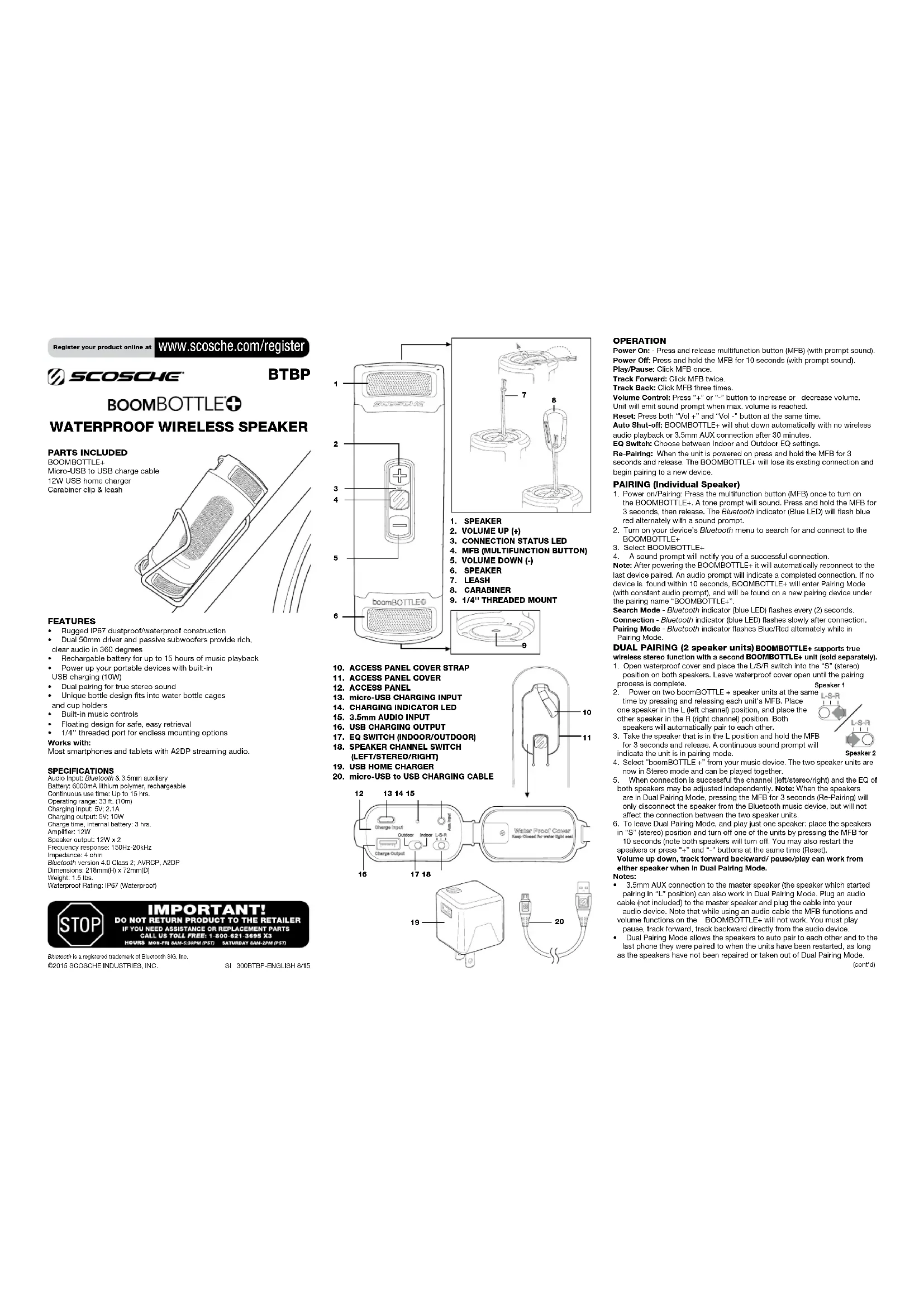 teur de votre ordinateur. Cet appareil est conforme aux normes RSS ne nécessitant pas de licence d'Industrie Canada.Lefonctionnementestsujetauxdeuxconditionssuivantes:(1)cetappareil ne doit pas causer d’interférence, et (2) cet appareil doit pouvoir accepter toute interférence reçue, incluant l’interférence qui peut engendrer un fonctionnement non désiré de l'appareil. En vertu des réglementations d'Industrie Canada, cet émetteur radio ne peut fonctionner qu'en utilisant une antenne d'un type et d'un maximum (ou moindre) de gain approuvé pour l'émetteur par Industrie Canada. Pour réduire les éventuelles interférences radio à d'autres utilisateurs, le type d'antenne et son gain devraient être choisis de manière à ce que la puissance isotrope rayonnée équivalente ne soit pas plus que ce qui est nécessaire pour une communication réussie. IC : 6955A-BT+ GARANTIE LImITÉE Scosche Industries, Inc. garantit ce produit d’être libre de tout défaut de matériaux et de fabricationpourunepériodede90joursàpartirdeladatedel’achat.CeproduitScosche est vendu sous entente que l’acheteur a indépendamment déterminé l’adaptabilité de ce produit. Cette garantie NE COUVRE PAS les frais accessoires ou autres encourus pour l’installation, le retrait ou la réinstallation de ce produit dans le véhicule. Cette garantie est offerte à l’acheteur original seulement. Cette garantie ne couvre pas le produit s’il est physiquement endommagé, ou soumis à la négligence ou à l’abus, à l’usage inapproprié, à une installation mal appropriée, à la modification, à un accident ou à une catastrophe naturelle. Aussi exclus de cette garantie sont les frais encourus pour la rectification d’une installation défectueuse et pour l’élimination d’une interférence électromagnétique (bruit causé par le moteur). Le reçu de caisse original indiquant la date de l’achat établira l’admissibilité à la garantie. Si le produit est trouvé défectueux en dedans de la période de la garantie, renvoyer le produit accompagné de la preuve d’achat chez Scosche Industries, Inc. Scosche, à sa discrétion, réparera ou remplacera l’unité sans frais et paiera les frais d’expédition du retour par la poste au client. Scosche, en aucune circonstance ne sera responsable pour les réclamations au-delà de la valeur de remplacement du produit défectueux et refuse toute responsabilité envers les dommages incidents ou accessoires. Aucune garantie explicite ou implicite, soit d’adaptabilité pour un usage particulier ou autre, sauf celle qui précède (laquelle est expressément présentée au lieu de toutes autres garanties), ne sera applicable aux produits. Scosche Industries ne sera aucunement responsable pour les divergences et/ou les variations qui pourraient se produire en raison des changements ou options apportés par les fabricants d’automobiles.©2015 SCOSCHE INDUSTRIES, INC.SI 300BTBP - ITALIANO 8/15 ALTOPARLANTE WIRELESS IMPERMEABILE BTBP SPECIFICHE Ingresso audio: Bluetooth e ausiliario da 3,5 mmBatteria: 6000mA ai polimeri di litio, ricaricabileDurata in uso continuativo: fino a 15 orePortata di funzionamento: 33 ft. (10 m)Ingresso di ricarica: 5V; 2,1A Uscita di ricarica: 5V; 10WDurata di ricarica, batteria interna: 3 oreAmplificatore: 12WUscita altoparlante: 12W x 2Risposta in frequenza: 150Hz-20kHzImpedenza: 4 ohmBluetooth versione 4.0 classe 2; AVRCP, A2DPDimensioni: 218 mm (H) x 72 mm (D) Peso: 1,5 lbs. (680 g) Classificazione di impermeabilità: IP67 (Impermeabile) PARTI INCLUSE BOOMBOTTLE + Cavo di ricarica micro USB a USB Caricatore da muro USB 12W Clip con moschettone e guinzaglio Bluetooth un marchio registrato di Bluetooth SIG, Inc. CARATTERISTICHE