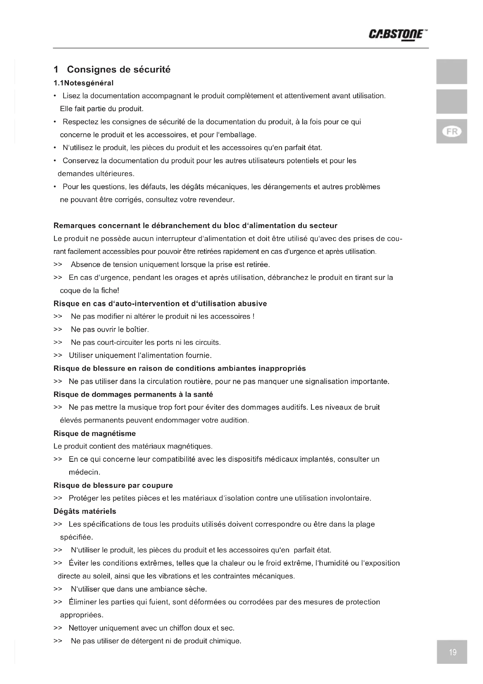 - Pourlesquestions,lesdéfauts,lesdégâtsmécaniques,lesdérangementsetautresproblèmes nepouvantêtrecorrigés,consultezvotrerevendeur. Remarques concernant le débranchement du bloc d‘alimentation du secteur Leproduitnepossèdeaucuninterrupteurd‘alimentationetdoitêtreutiliséqu‘avecdesprisesdecou- rantfacilementaccessiblespourpouvoirêtreretiréesrapidementencasd‘urgenceetaprèsutilisation. >> Absencedetensionuniquementlorsquelapriseestretirée. >> Encasd‘urgence,pendantlesoragesetaprèsutilisation,débranchezleproduitentirantsurla coquedelache! Risque en cas d‘auto-intervention et d‘utilisation abusive >> Nepasmodiernialtérerleproduitnilesaccessoires! >> Nepasouvrirleboîtier. >> Nepascourt-circuiterlesportsnilescircuits. >> Utiliser uniquement l‘alimentation fournie. Risque de blessure en raison de conditions ambiantes inappropriés >> Nepasutiliserdanslacirculationroutière,pournepasmanquerunesignalisationimportante. Risque de dommages permanents à la santé >> Nepasmettrelamusiquetropfortpouréviterdesdommagesauditifs.Lesniveauxdebruit élevéspermanentspeuventendommagervotreaudition. Risque de magnétisme Leproduitcontientdesmatériauxmagnétiques. >> Encequiconcerneleurcompatibilitéaveclesdispositifsmédicauximplantés,consulterun médecin. Risque de blessure par coupure >> Protégerlespetitespiècesetlesmatériauxd‘isolationcontreuneutilisationinvolontaire. Dégâts matériels >> Lesspécicationsdetouslesproduitsutilisésdoiventcorrespondreouêtredanslaplage spéciée. >> N‘utiliserleproduit,lespiècesduproduitetlesaccessoiresqu‘enparfaitétat. >> Éviterlesconditionsextrêmes,tellesquelachaleuroulefroidextrême,l‘humiditéoul‘exposition directe au soleil, ainsi que les vibrations et les contraintes mécaniques. >> N‘utiliserquedansuneambiancesèche. >> Éliminerlespartiesquifuient,sontdéforméesoucorrodéespardesmesuresdeprotection appropriées. >> Nettoyer uniquement avec un chiffon doux et sec. >> Nepasutiliserdedétergentnideproduitchimique.Mode d‘emploi